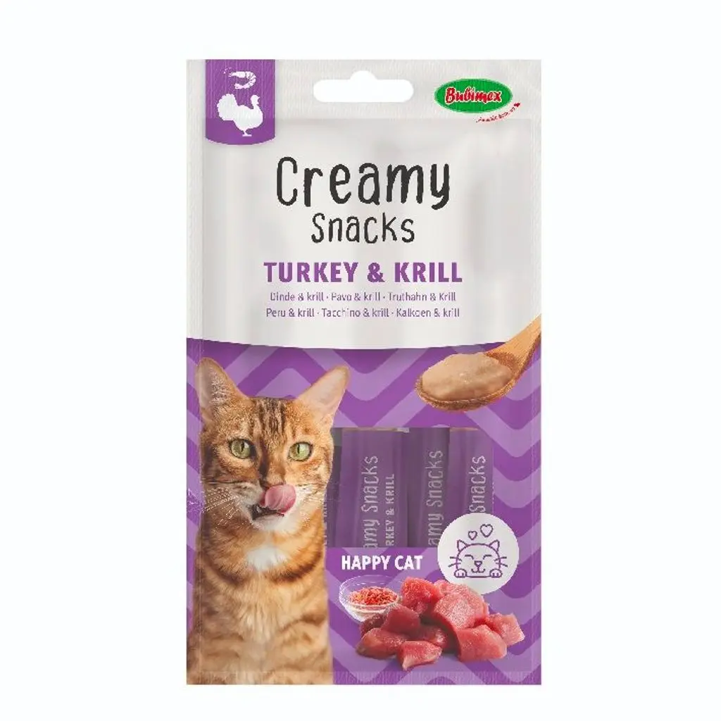 BUBIMEX CREAMY PAVO KRILL es un alimento complementario para gatos. Perfectos para recompensar a su gato, los snacks cremosos Bubimex son ligeros e hidratantes, gracias a su textura cremosa, pueden lamerse fácilmente directamente del envase. Además, la raíz de achicoria, gracias a su efecto prebiótico, contribuye a una mejor salud intestinal y una digestión más eficiente.