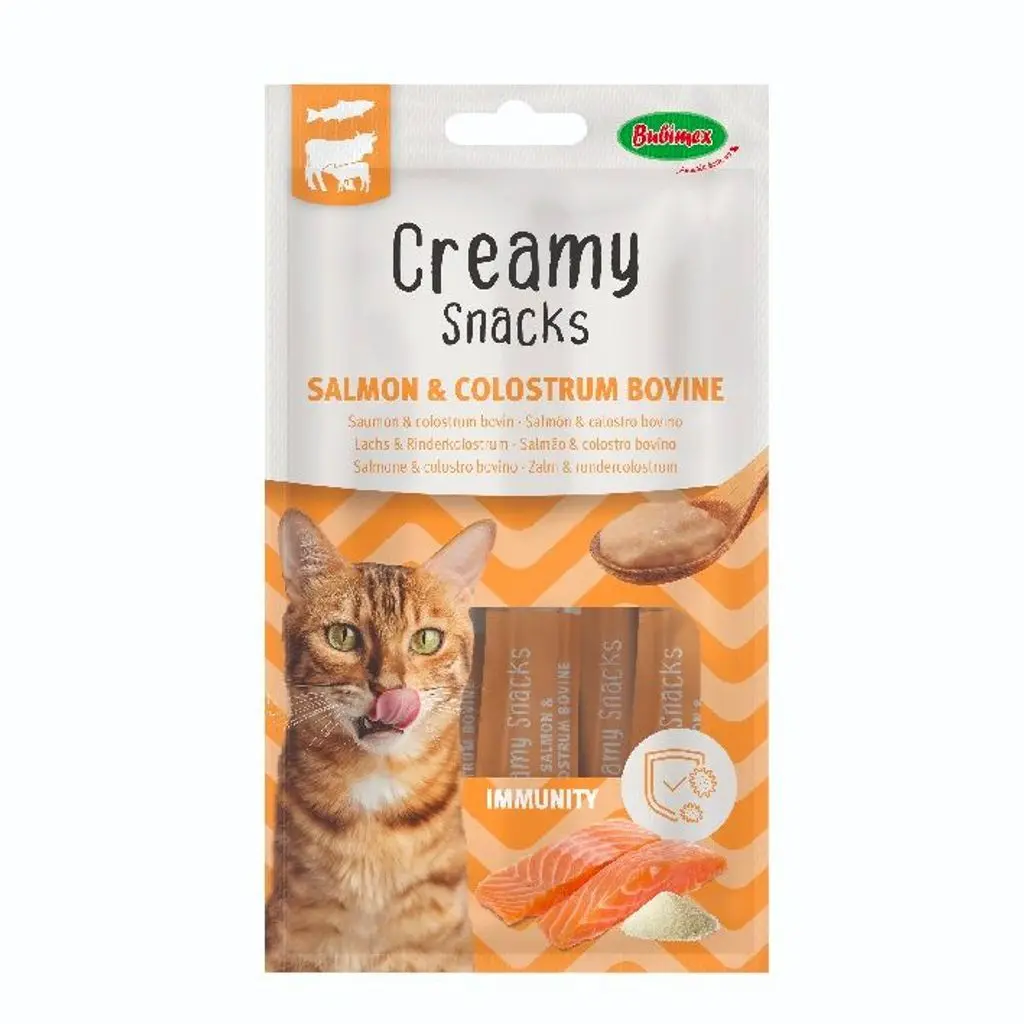 BUBIMEX CREAMY SALMÓN Y CALOSTRO DE BUEY es un alimento complementario para gatos. Perfectos para recompensar a su gato, los snacks cremosos Bubimex son ligeros e hidratantes, gracias a su textura cremosa, pueden lamerse fácilmente directamente del envase. Además, la raíz de achicoria, gracias a su efecto prebiótico, contribuye a una mejor salud intestinal y una digestión más eficiente.