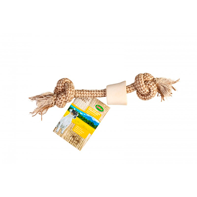 BUBIMEX enriquece su gama de juguetes naturales con estos cordones adornados con anillas de hueso. Sin colorantes ni aditivos químicos, este juguete lúdico y apetecible satisfará las necesidades masticatorias de perros de todas las edades y razas con su combinación de texturas blandas y duras, animales y vegetales. Los nudos de la cuerda permiten que el amo participe del juego, fortaleciendo así el vínculo con su animal mientras participa en su salud dental.