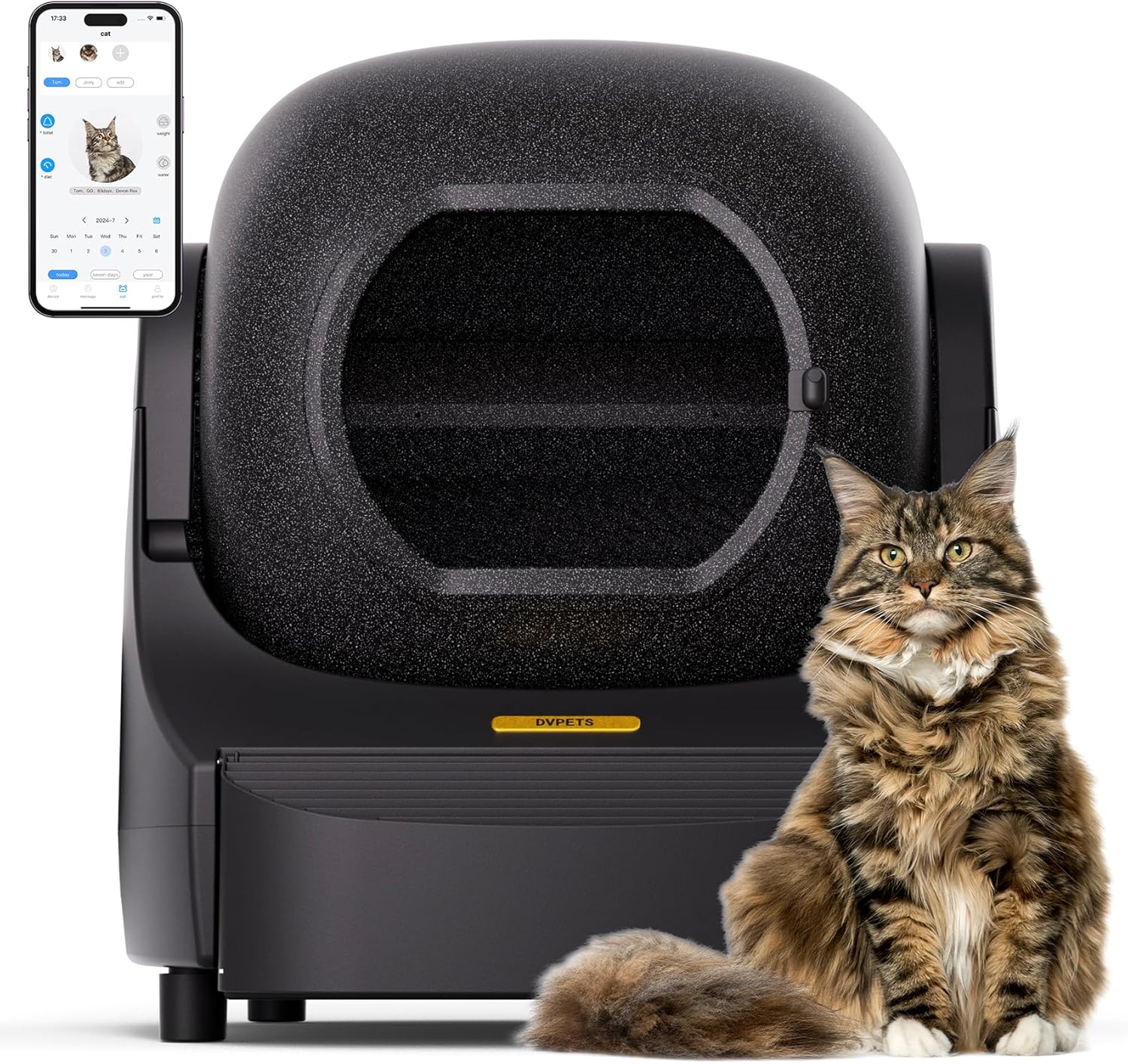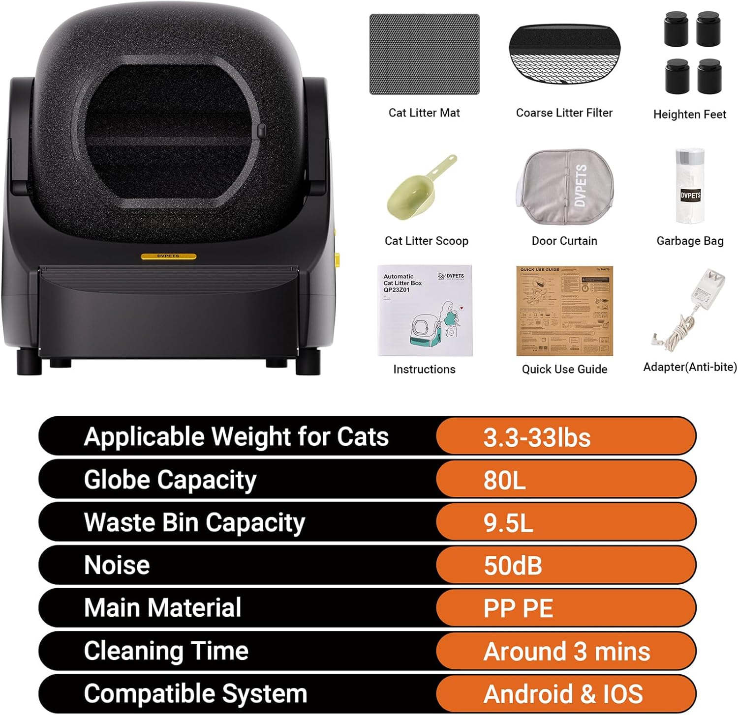 Eliminación de olores: DVPETS ofrece el triple de eliminación de olores, eliminando olores desagradables. El sello de silicona elimina los olores en la fuente, mientras que la cortina sellada y la máquina de aroma desodorizante mantienen el ambiente fresco de la caja de arena, asegurando que tu hogar permanezca limpio. El motor de bajo ruido (tan bajo como 40 dB) garantiza ciclos de limpieza silenciosos y suaves sin molestarte a ti ni a tu gato.