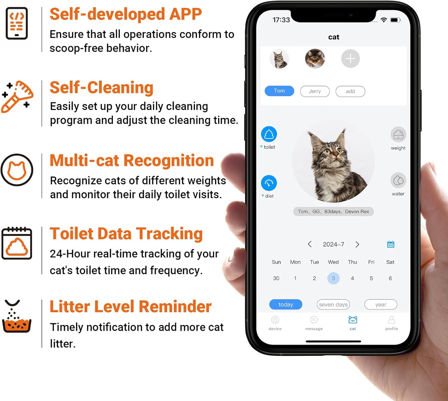 Manejo remoto de la aplicación: esta aplicación de robot de arena para gatos de desarrollo propio está diseñada completamente en función de la experiencia real de los usuarios de gatos, asegurando que todas las operaciones encajen perfectamente con el comportamiento diario de la pala de excremento. Ya sea que sea un hogar de un solo gato o un propietario de varios gatos, es fácil de administrar. La aplicación te notifica al instante después de cada limpieza y también registra el peso de cada gato para una fácil identificación. Además de eso, puede configurar fácilmente un programa de limpieza diario y ajustar los tiempos de limpieza. ¡Con solo unos pocos clics, puede administrar todo desde su teléfono!