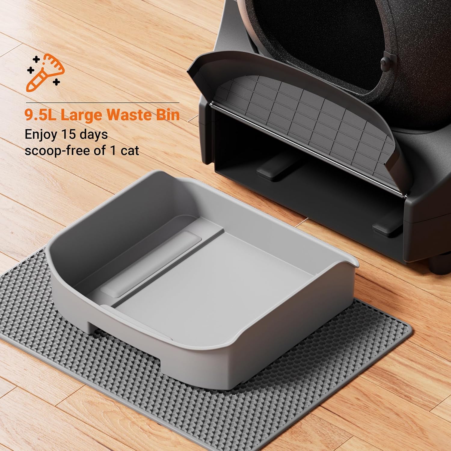 Papelera grande de 9.5L: hasta 15 días sin recoger, con doble uso como caja de arena temporal. El sensor de peso patentado monitorea constantemente la salud de tu gato. Con un simple tirón, los desechos se eliminan fácilmente, proporcionando comodidad, y se pueden transportar sin presión.