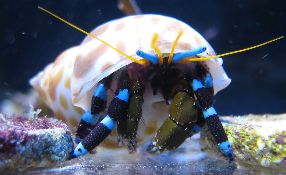 Pequeño cangrejo ermitaño de la zona del Indo pacifico, inofensivo de apenas unos centimetros, algivoro y detrivoro y de llamativas patas azules y antenas, parecido al cibarinus, pero mas llamativo.