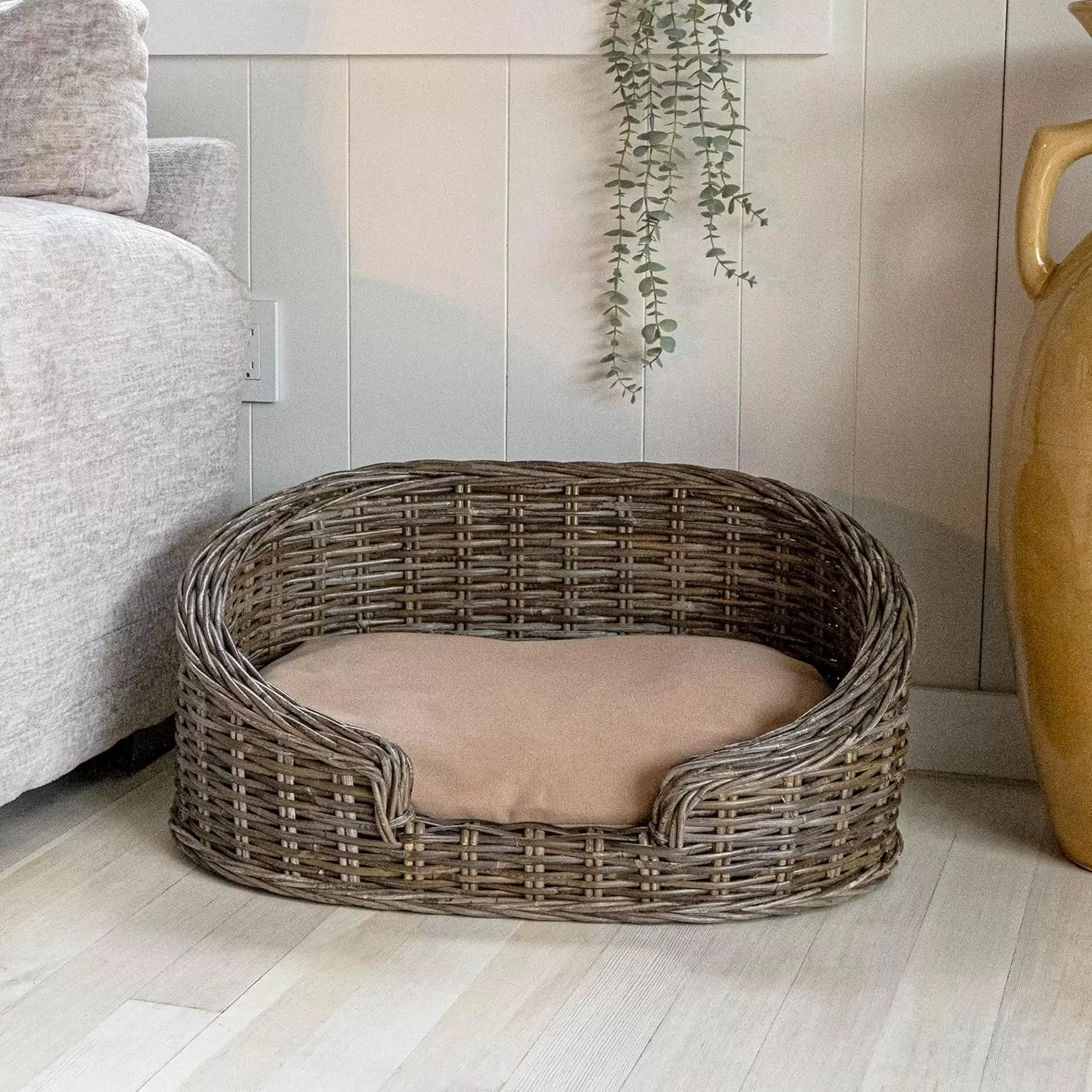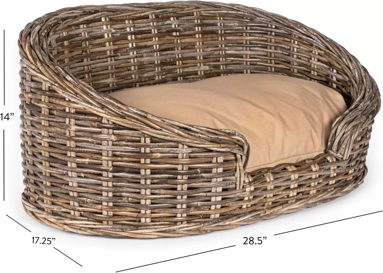 Cama de ratán Kubu gris con cojín de felpa beige. Diseño estilo costa de construcción robusta y elegante. Ideal para mascotas de menos de 15 kg que merecen el máximo confort.