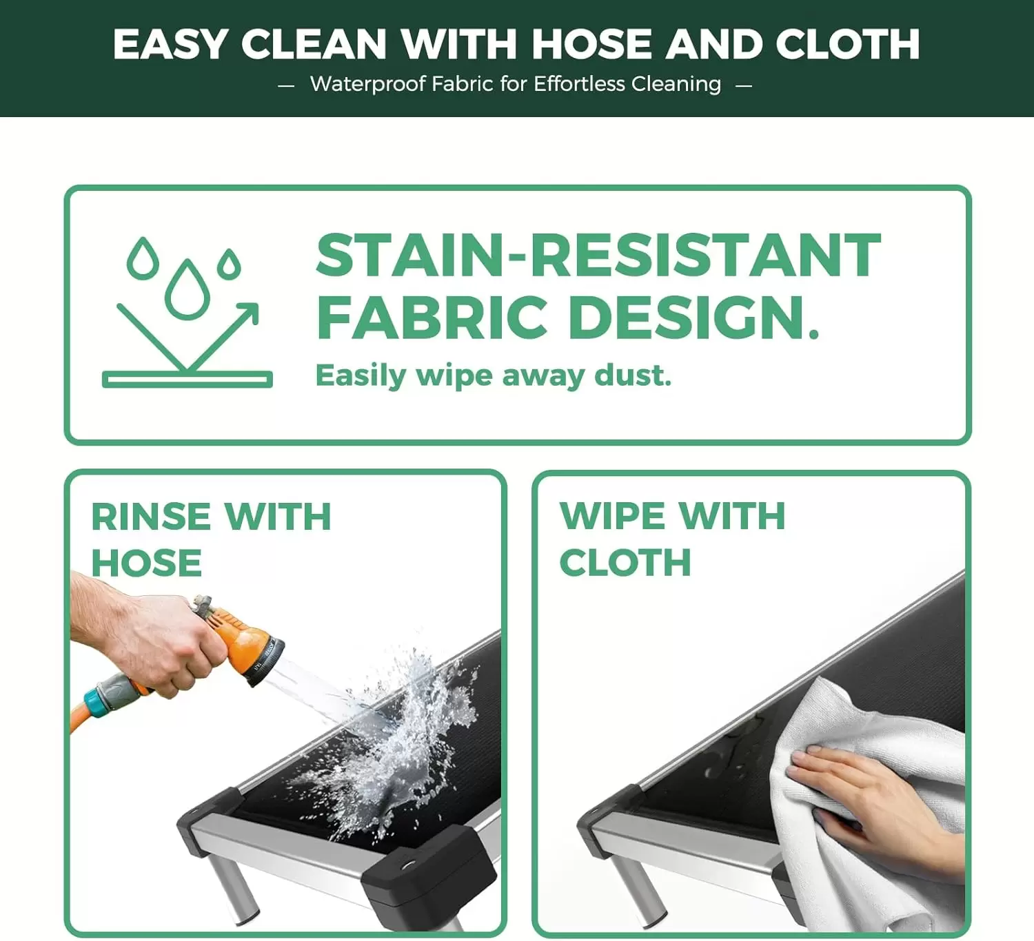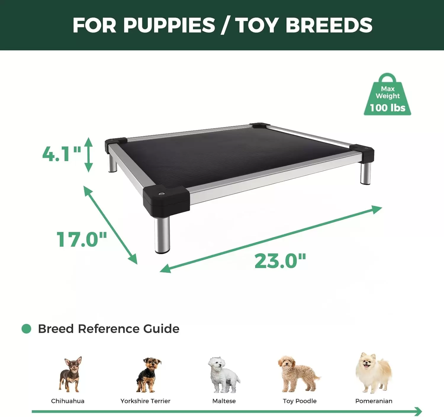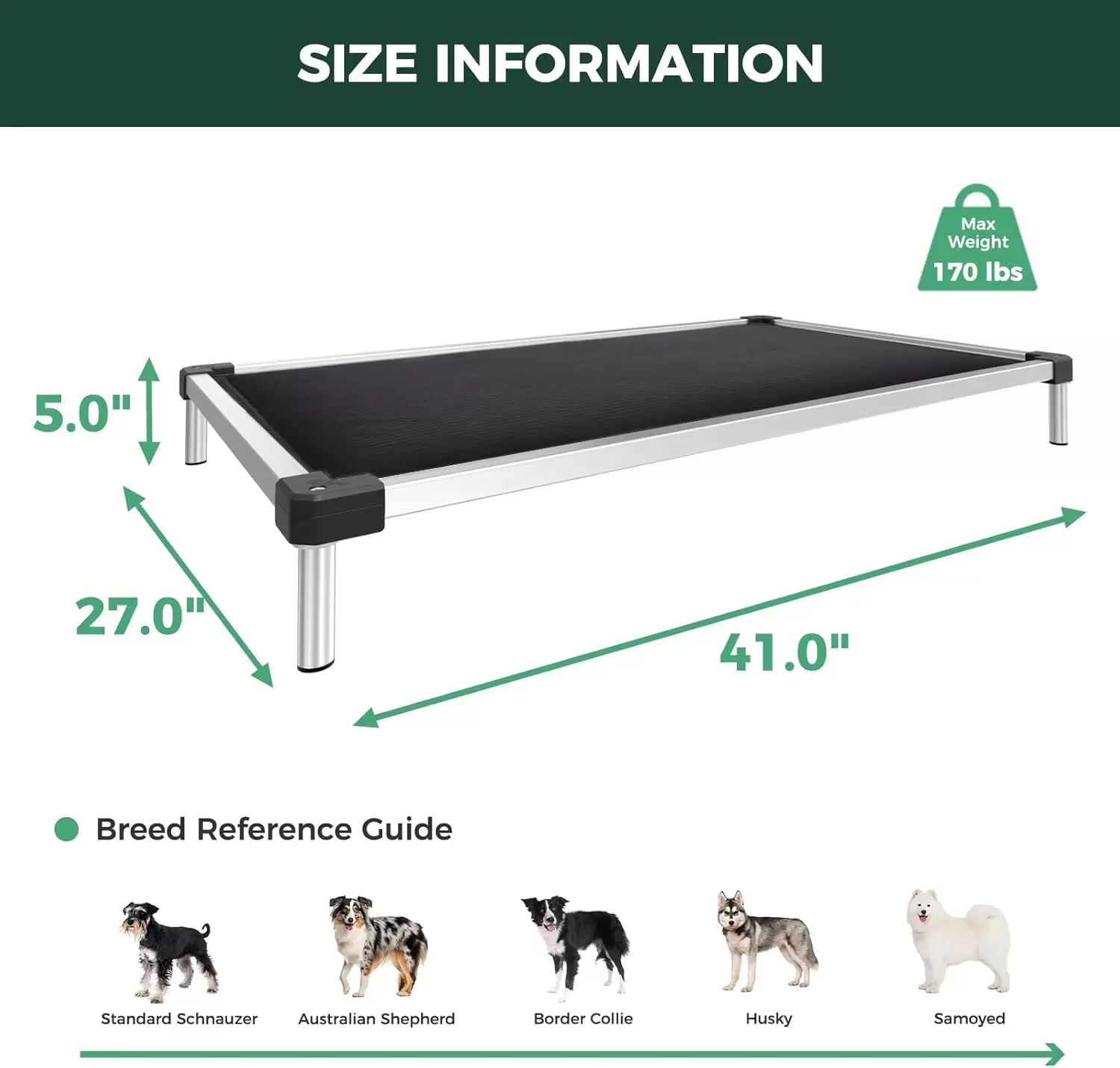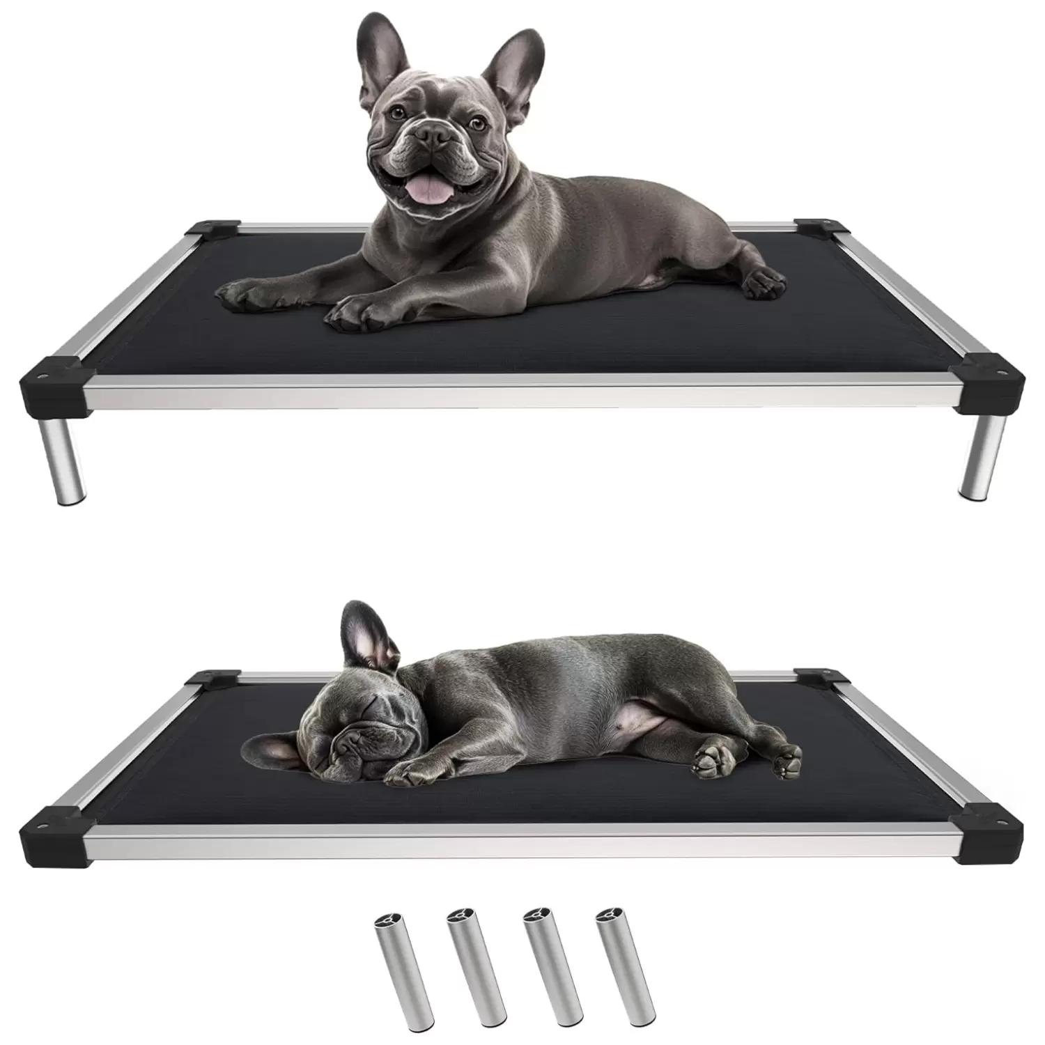 Cama elevada indestructible (soporta 113 kg). Marco de aluminio a prueba de masticación con durabilidad de 15 años. Soporte articular y montaje ultrarrápido de 90 segundos.