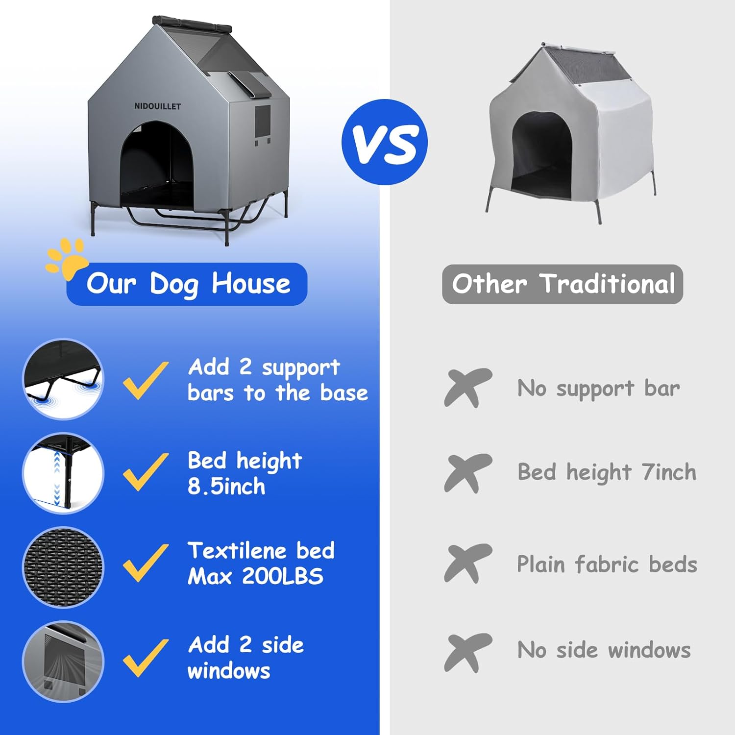 ¿Qué hace que nuestra casa para perros se destaque? La cama elevada para perros está hecha de material textileno de alta resistencia con 2 barras de soporte reforzadas, con capacidad para hasta 200 libras. Altura elevada de la cama para perros actualizada de 7 a 8.5 pulgadas. El textileno es impermeable, resistente a la abrasión, transpirable y fácil de limpiar con agua. Envuelto en tela Oxford de PVC 600D, que proporciona una excelente protección contra el viento, la lluvia y la nieve. No te preocupes por que el perro raye la casa del perro. Hemos añadido dos nuevas ventanas para mejorar aún más la ventilación y la interacción de tu perro.