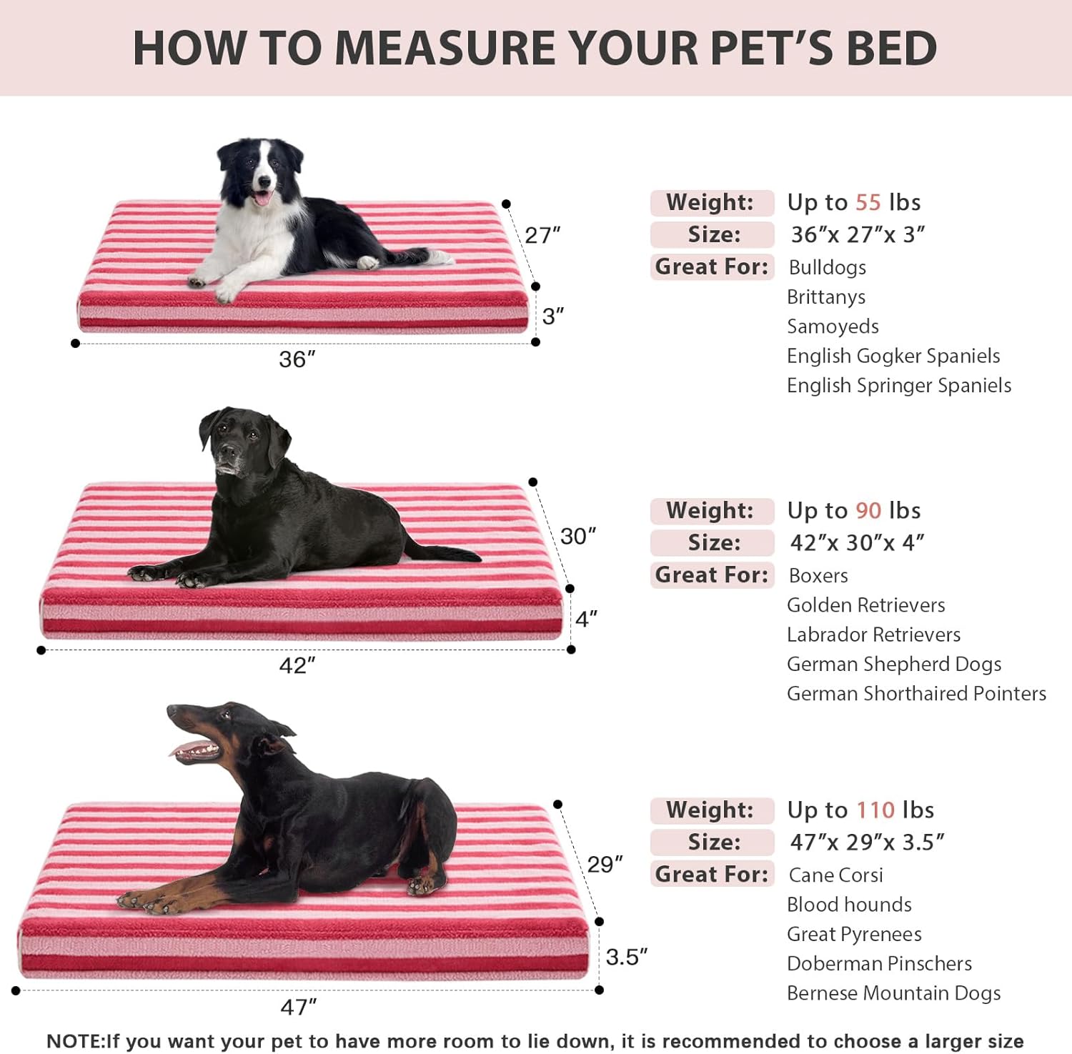 Detalles del tamaño de la cama grande para perros: 42 x 30 x 4 pulgadas, adecuada para perros de hasta 90 libras, camas para perros de gran tamaño, como boxers, golden retrievers, labradores, pastores alemanes y punteros alemanes de pelo corto. Sellado al vacío, déjalo salir al aire durante 72 horas para que se expanda completamente.