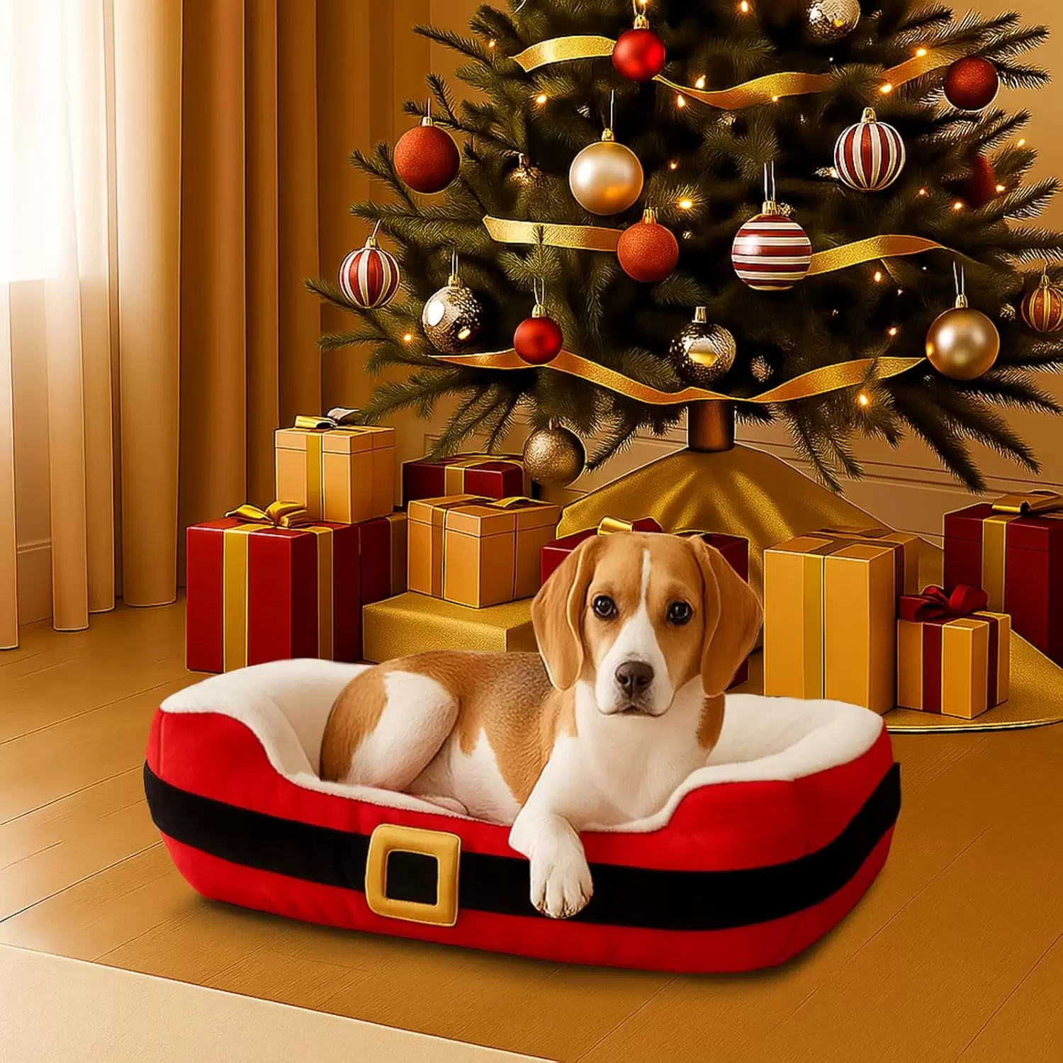 Cama Navideña (66x51x15 cm) con diseño Cinturón de Santa. Proporciona soporte para la columna y es apta para mascotas de hasta 14 kg. Diseño no desmontable para mayor durabilidad festiva.