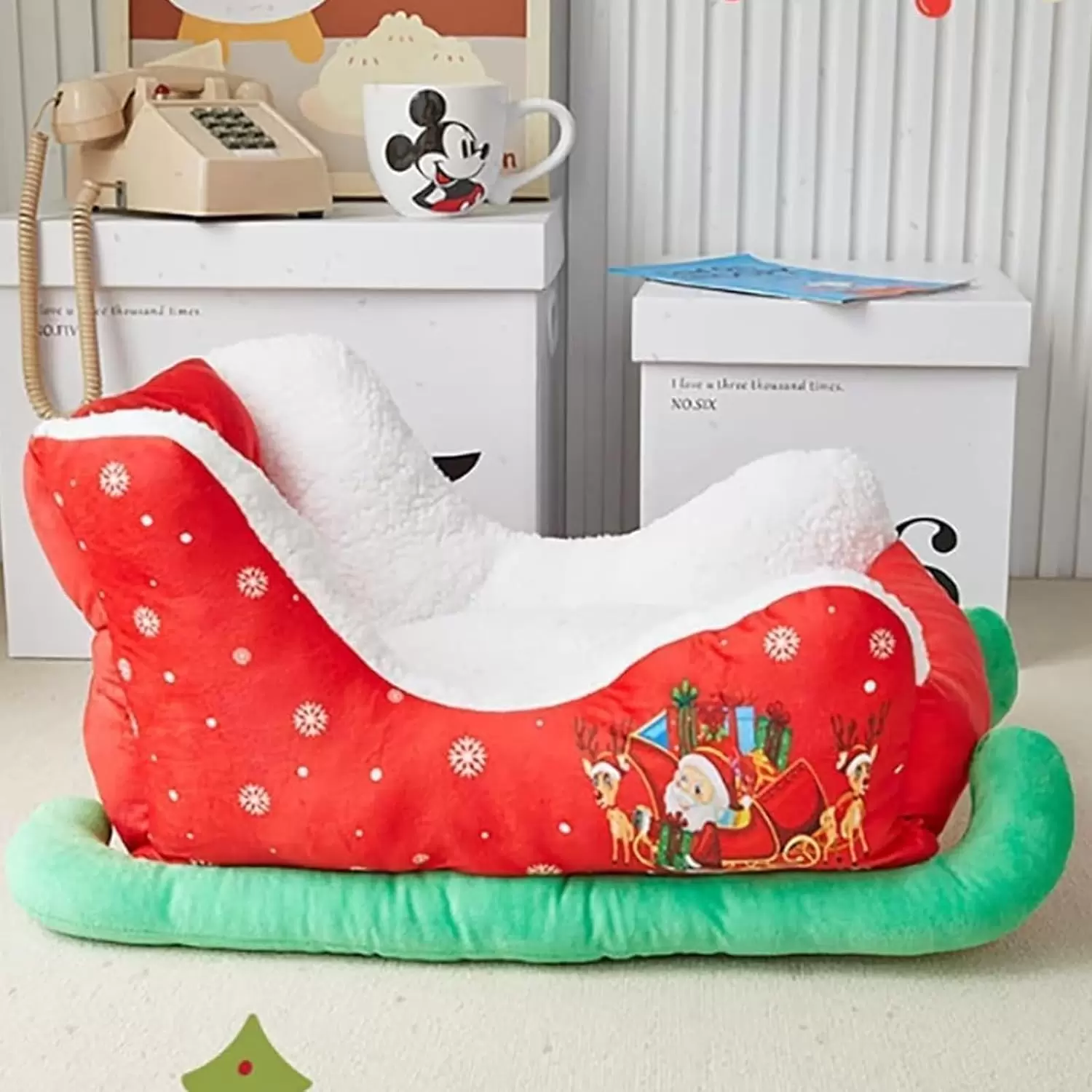 Cama navideña estilo trineo (60x38x28 cm) para mascotas pequeñas. Hecha de felpa suave y esponja de alta resistencia. Ideal para siestas festivas y complementar la decoración.
