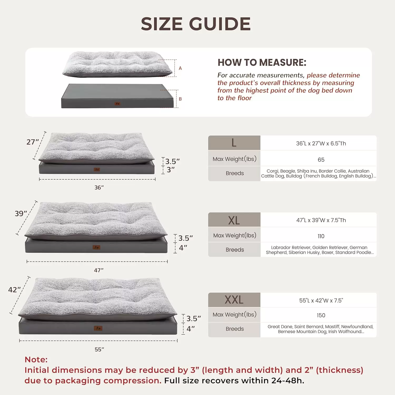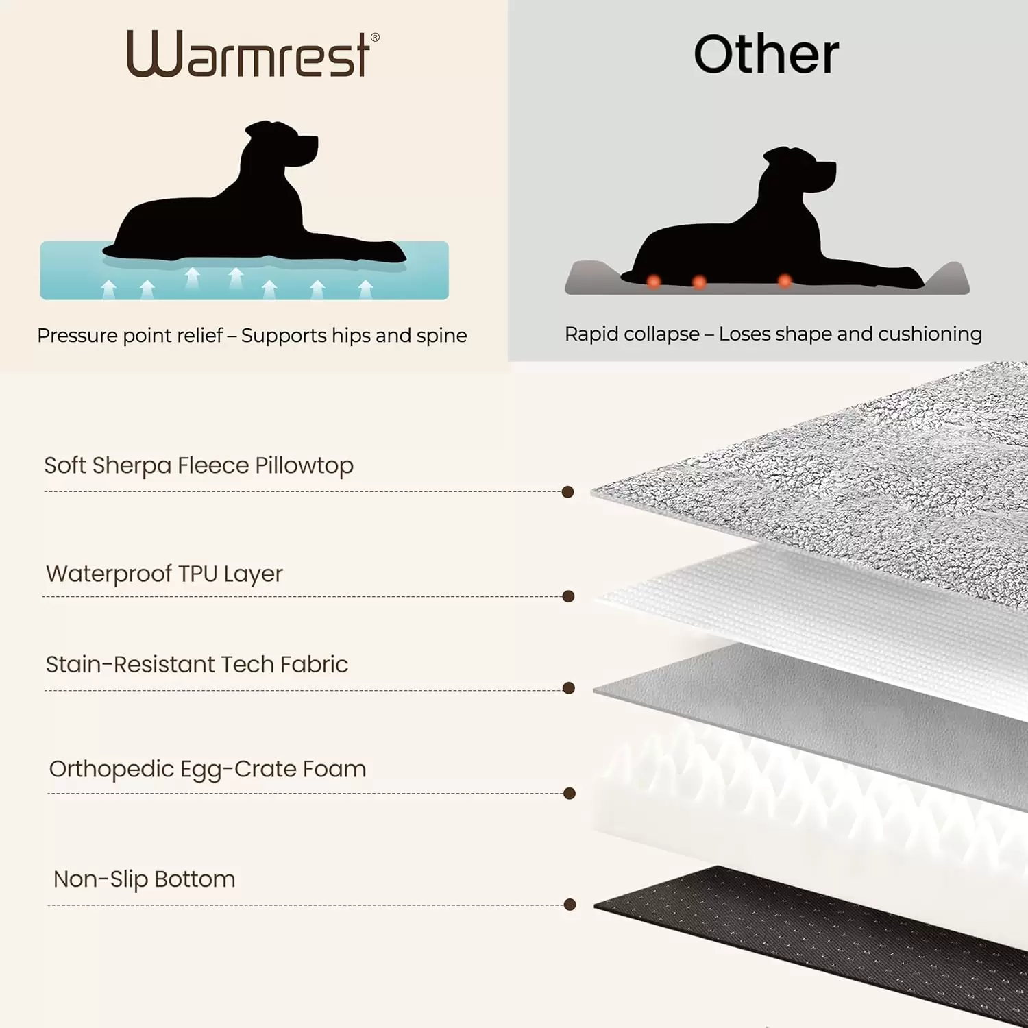 Olvídate de las camas que se aplanan. Nuestra cama plana incorpora una losa de espuma ortopédica extra gruesa (3 a 4 pulgadas), que distribuye el peso de manera uniforme, brindando un apoyo firme y constante a la cabeza, cuello, torso y articulaciones. Se eleva de $6.5 text{ a } 7.5 text{ pulgadas}$ del suelo, aislando el frío para una calidez y comodidad superiores.