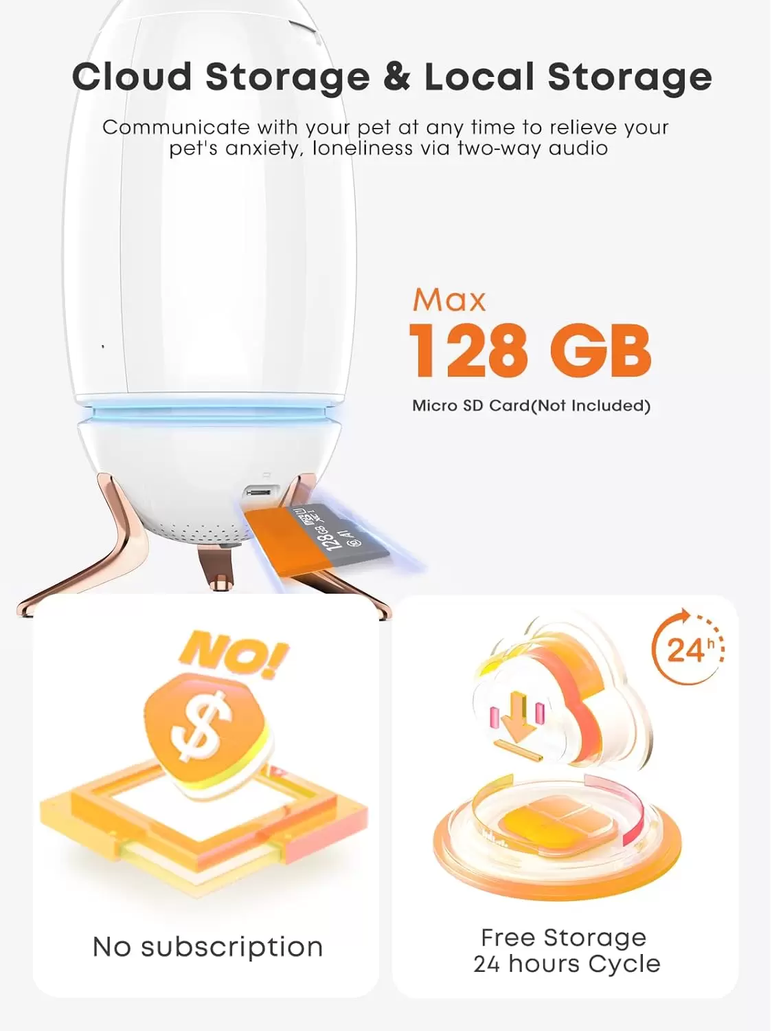 【2 opciones de almacenamiento】La cámara para perros Dokoo con lanzamiento de golosinas proporciona almacenamiento gratuito en la nube durante 24 horas. Sin subsuripción/tarifa mensual, también puede guardarlos directamente en el almacenamiento local de su teléfono para su mantenimiento permanente. Sin cargos ocultos en absoluto. También se admite tarjeta micro SD (soporta hasta 128 GB). Fácil de guardar todas las actividades de tu amigo peludo.
