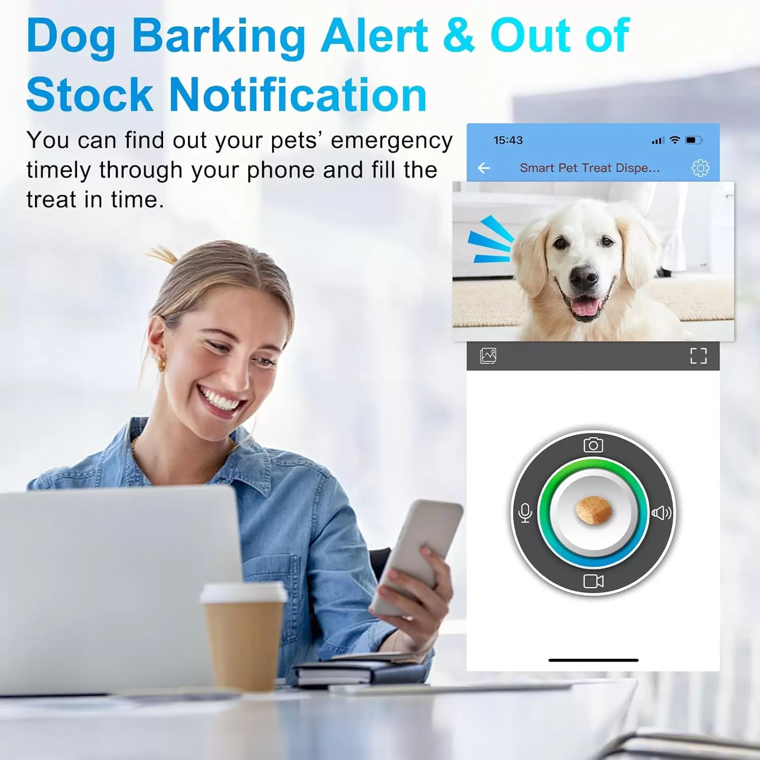 [Cámara multifuncional para mascotas]: Peinando la cámara y el dispensador de golosinas, puedes rellenar las golosinas favoritas de tu hijo peludo en el dispensador de golosinas y lanzar una golosina a tu perro o gato (s) de forma remota a través de la aplicación mientras estás lejos de tu casa. La cámara para perros está diseñada con alerta de movimiento avanzada y alerta de ladridos de perros, entonces puedes averiguar la emergencia de tus mascotas a tiempo a través de tu teléfono incluso si estás fuera de casa.