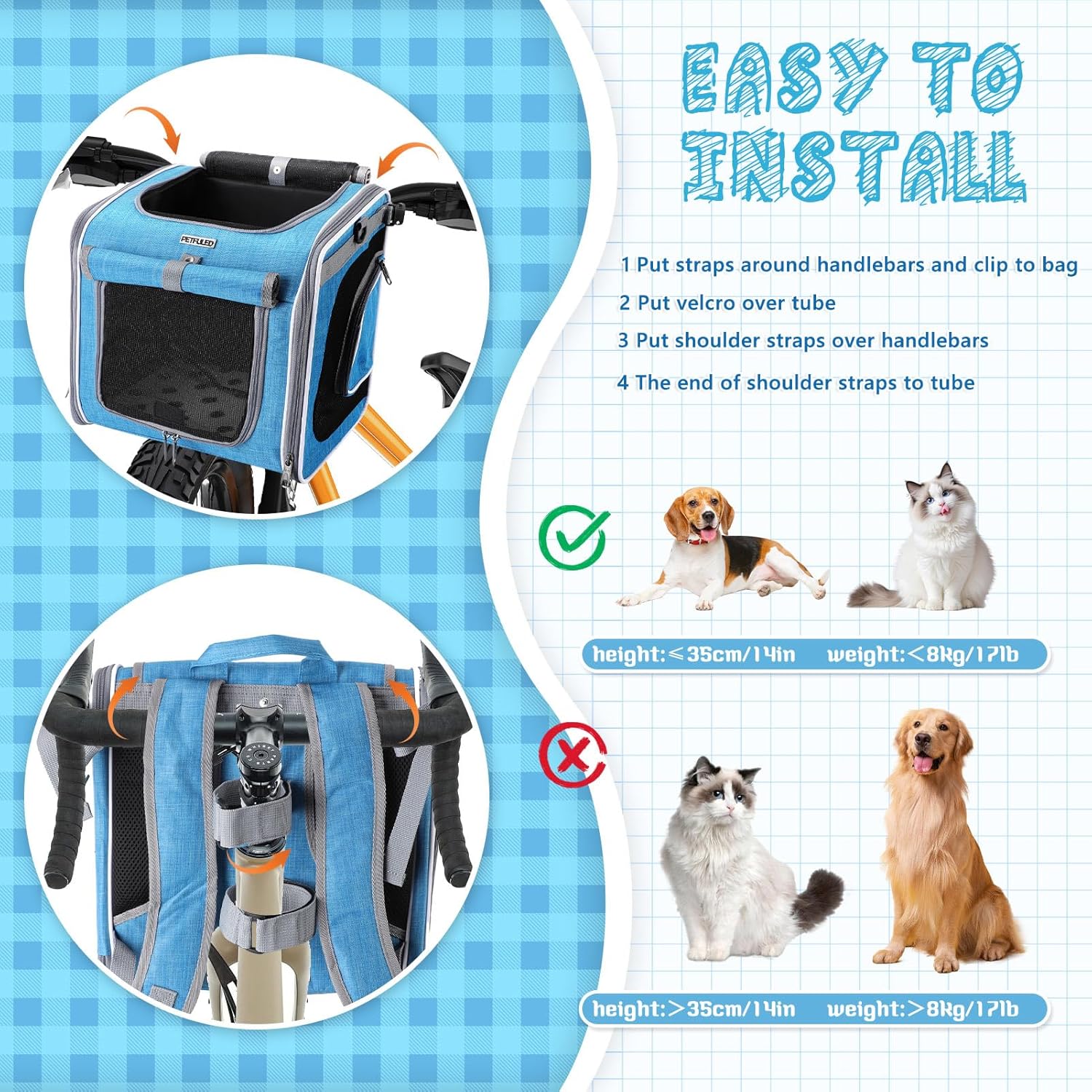 Correas traseras y laterales ajustables: la bolsa plegable para bicicleta para mascotas viene con arnés ajustable y correas laterales, puedes crear un ajuste cómodo y seguro ajustando el arnés a la forma única del cuerpo de tu mascota.