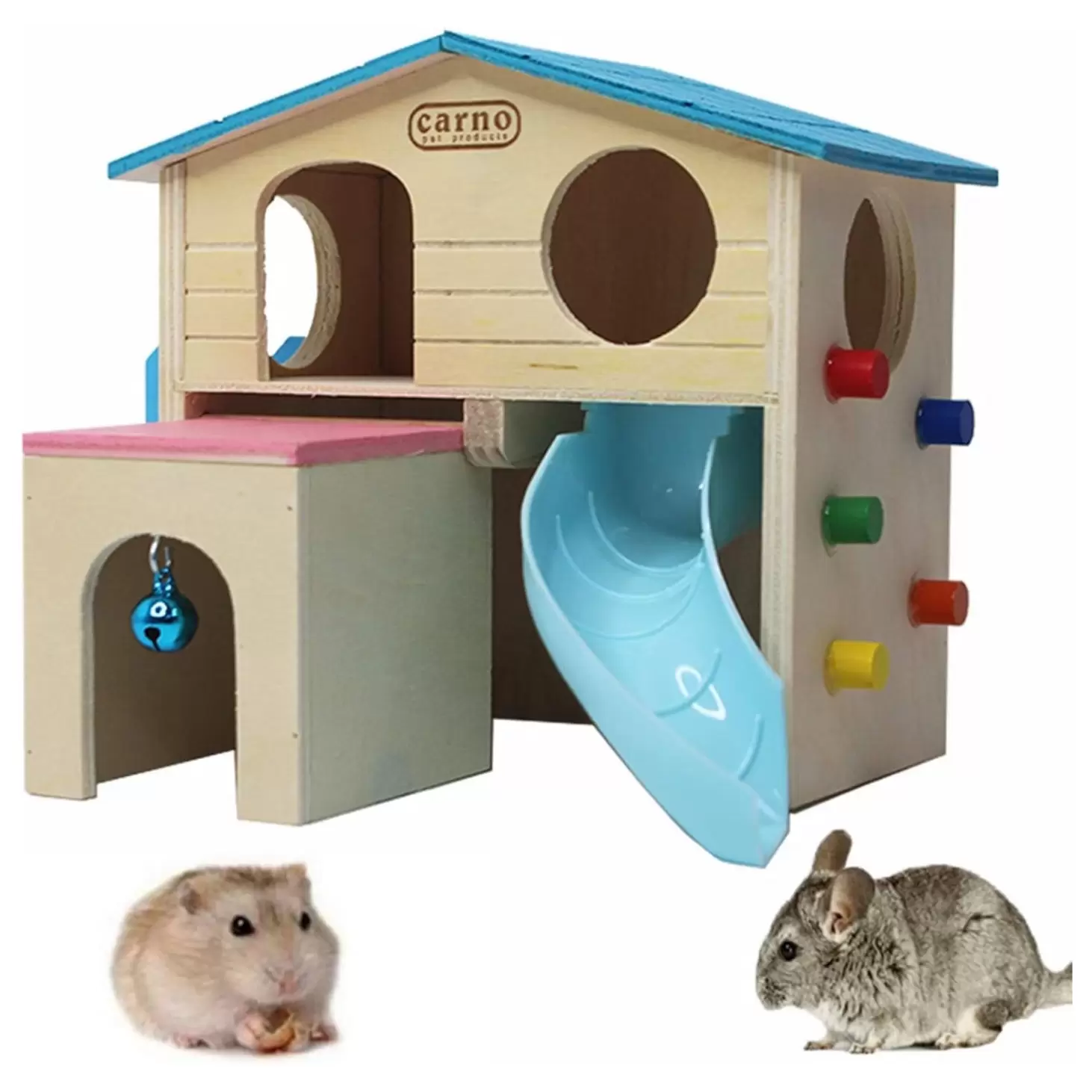 Cabaña de 3 pisos con balcón para roedores pequeños. Ofrece nido seguro, zona de escalada y gimnasio. Material ecológico con campana colgante para diversión.