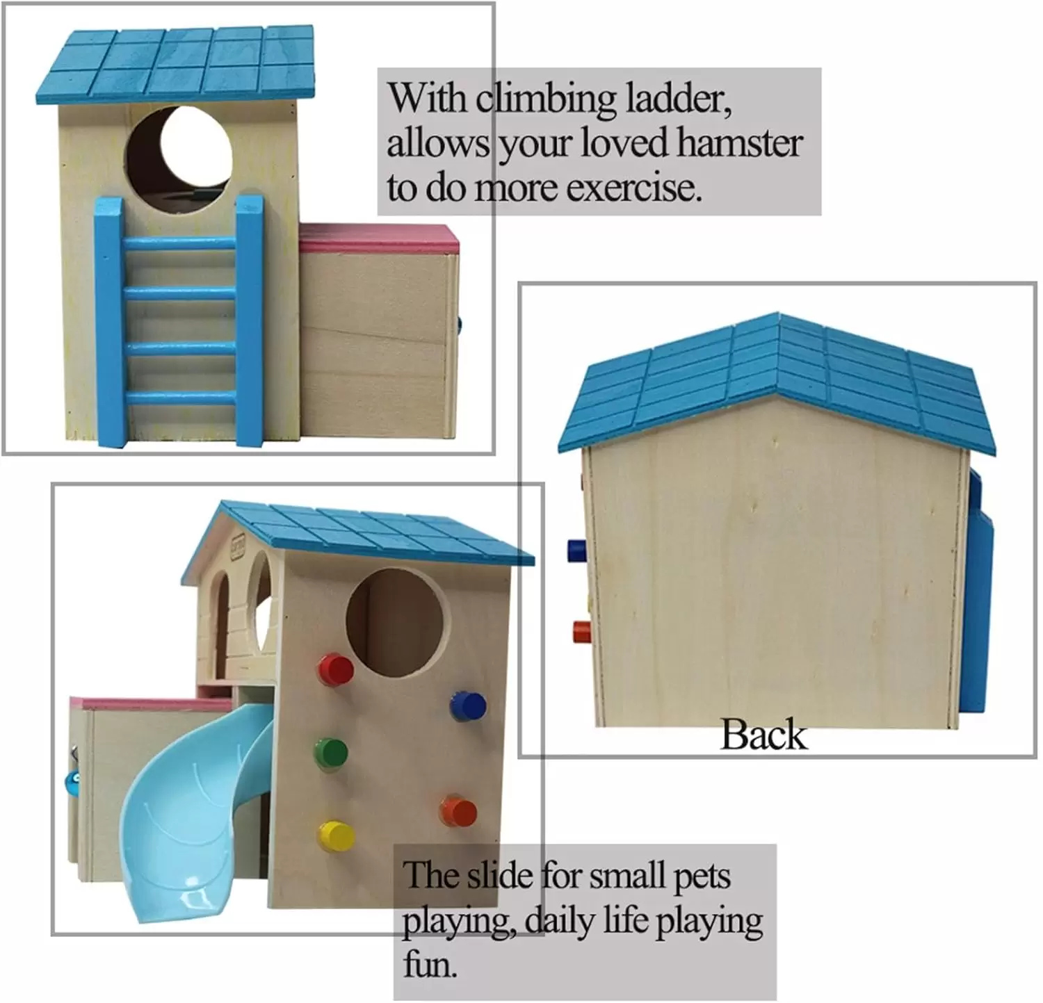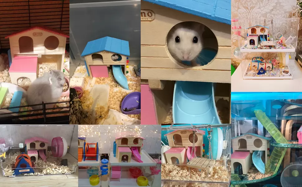 Tamaño de la casa de mascotas: 6.1 “L x 5.9″W x 6.2″H. Ideal para hámster, ratón y otros pequeños animales peludos.