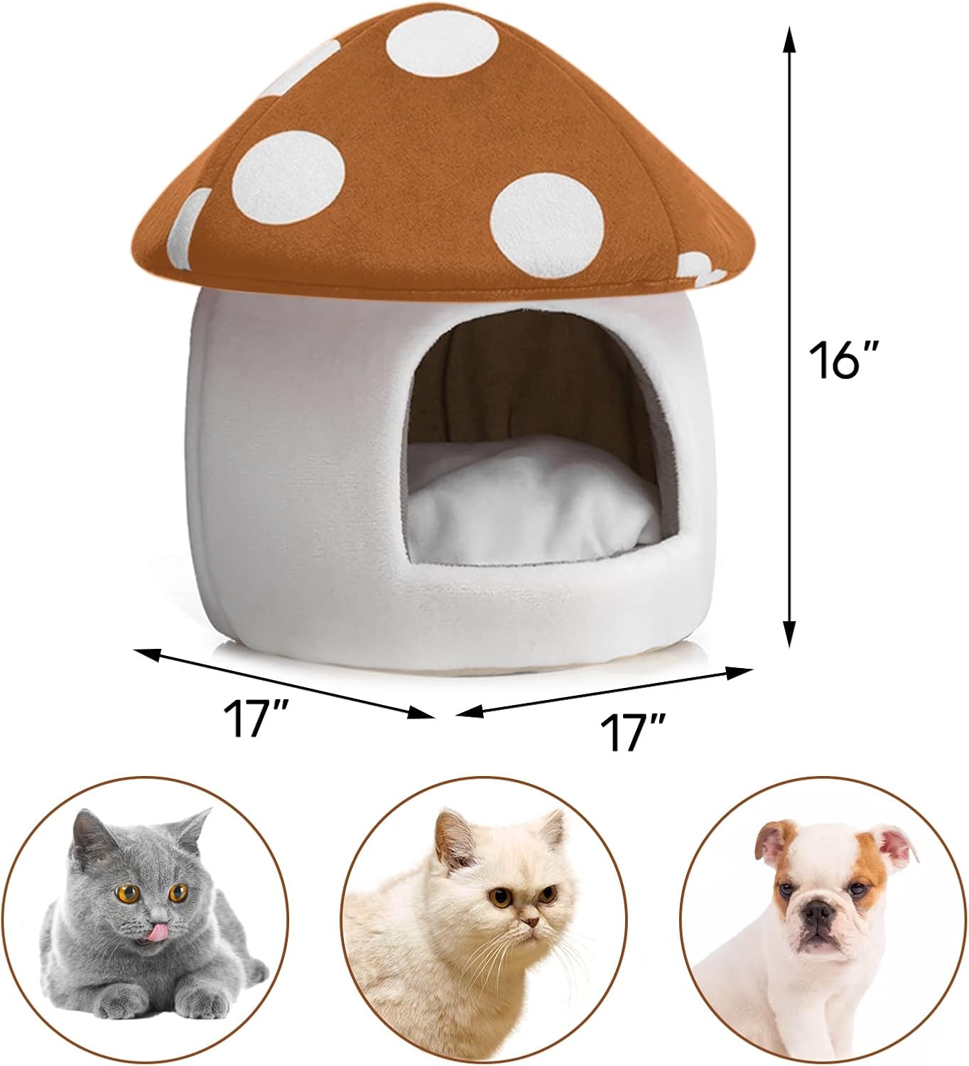 Dimensiones totales. Tamaño de la cama de hongos para gatos: 17L x 17W x 16H pulgadas. Adecuado para menos de 15 libras de gatos pequeños, gatitos, felinos, cachorros pequeños chihuahuan y otras mascotas como conejos o hurones.