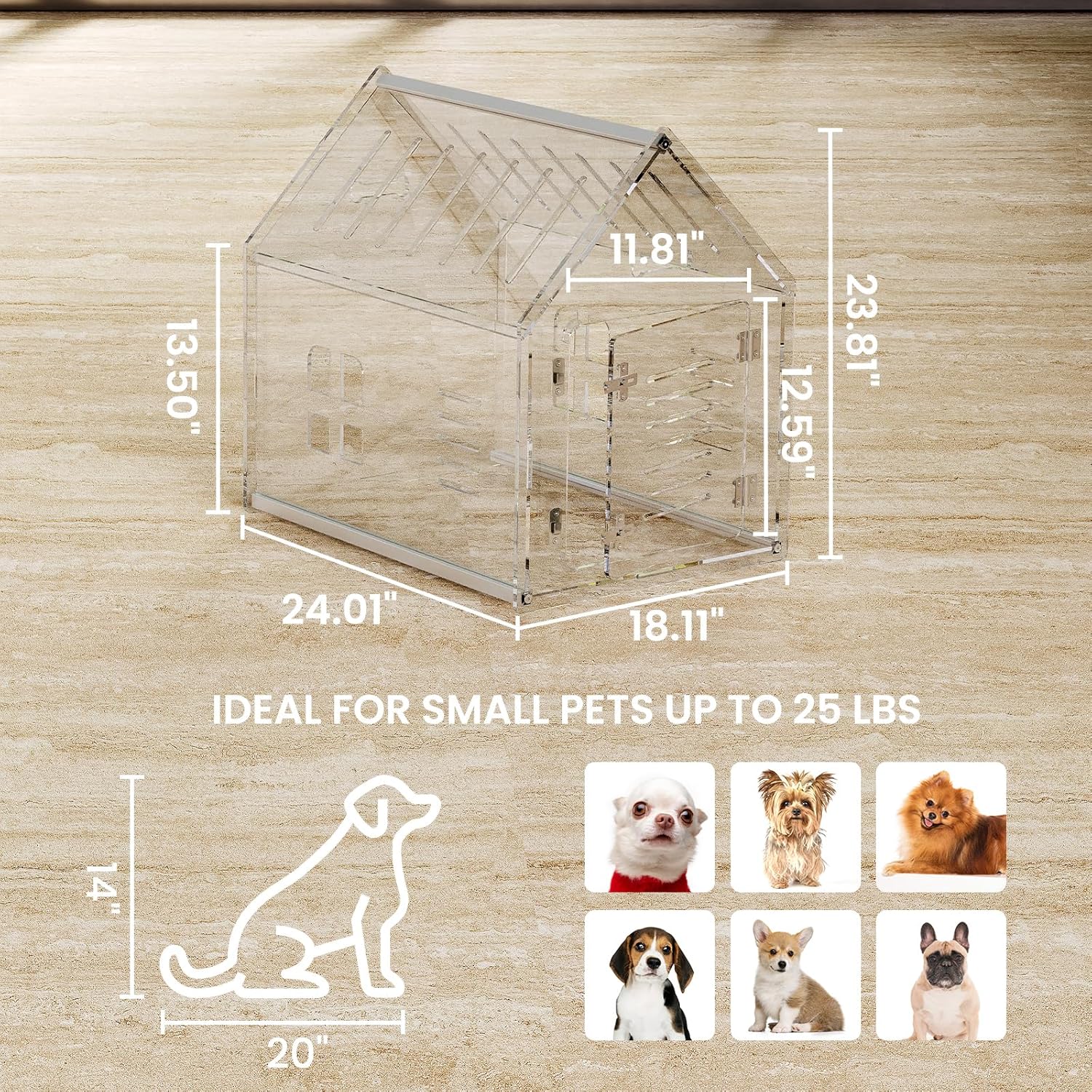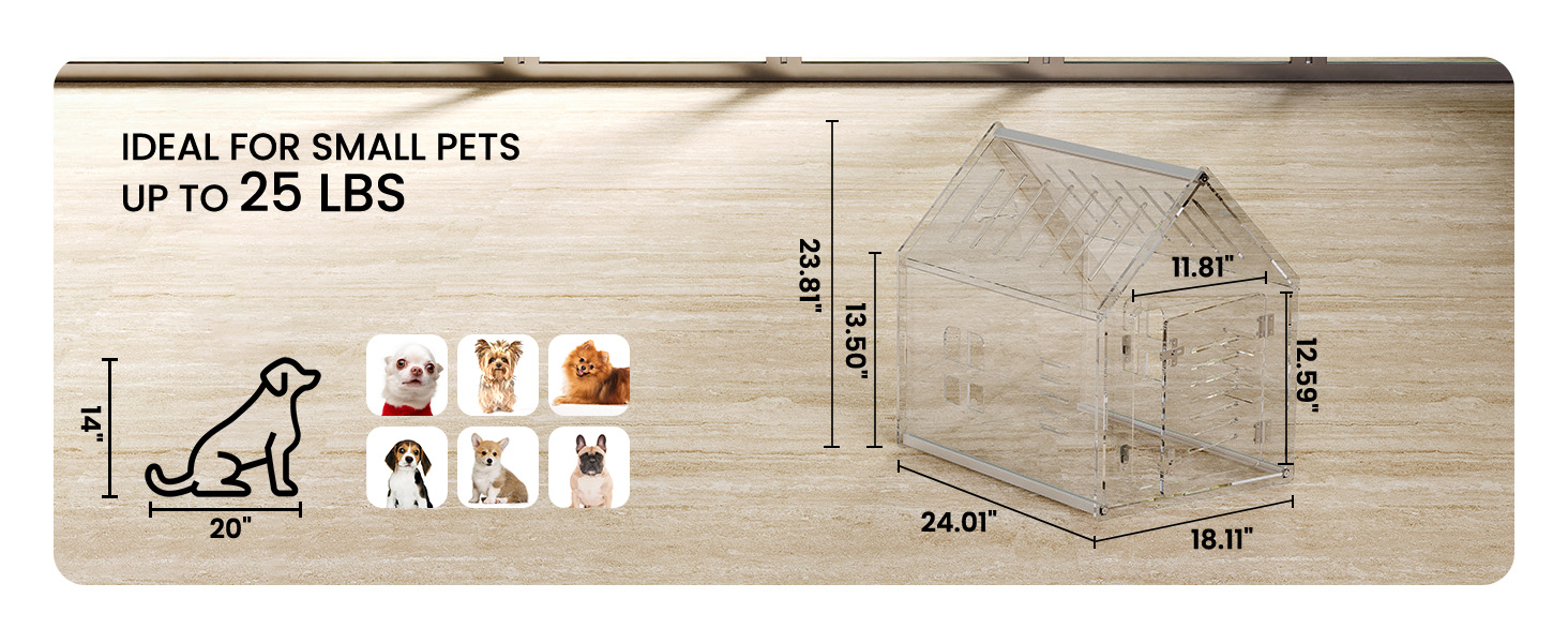 Se adapta a la mayoría de mascotas de tamaño pequeño Tamaño total: 24.01 pulgadas de largo x 18.11 pulgadas de ancho x 23.81 pulgadas de alto, tamaño interior de la casa: 23 pulgadas de largo x 16 pulgadas de ancho x 22 pulgadas de alto. Asegúrate de las dimensiones de tu perro antes de comprar nuestra jaula acrílica para perros para su comodidad.