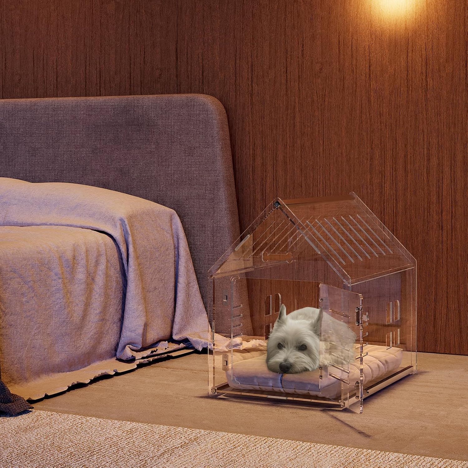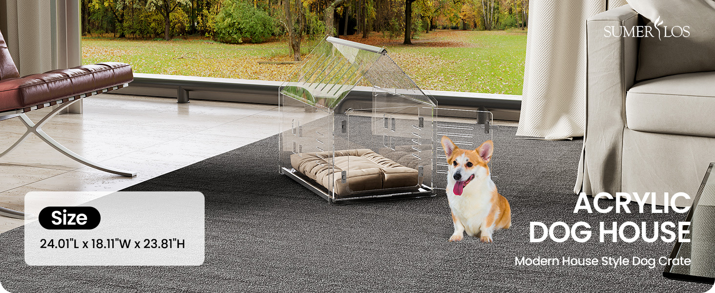 Material acrílico de alta calidad: la casa para perros de interior de Sumerflos está hecha de acrílico de alta calidad, con el aspecto de vidrio y la durabilidad del acero, totalmente no tóxico y seguro para tu cachorro, aspecto transparente que proporciona una visibilidad clara y se mezcla perfectamente con tu hogar.