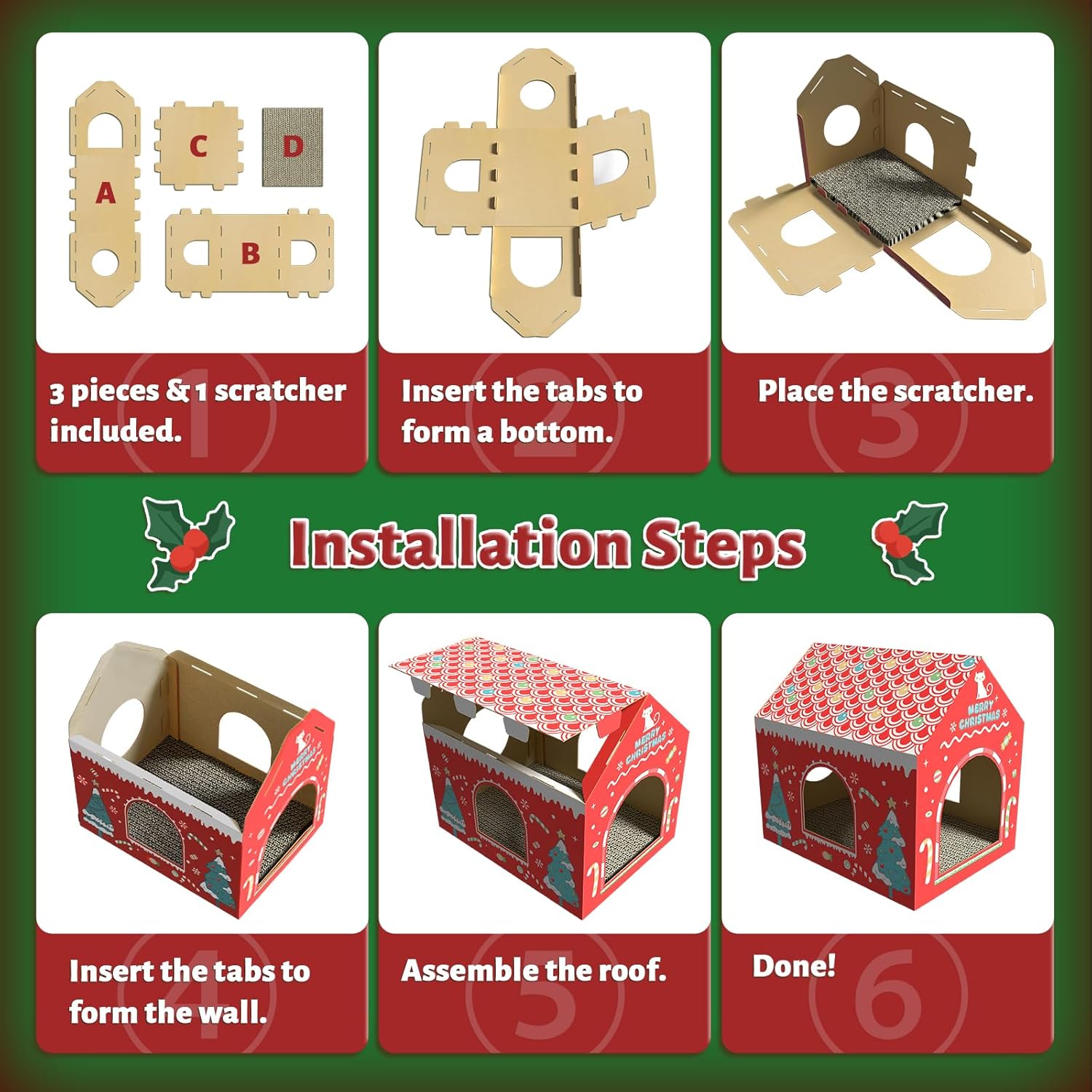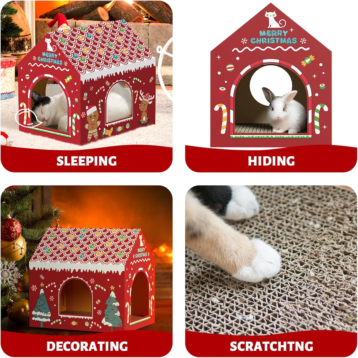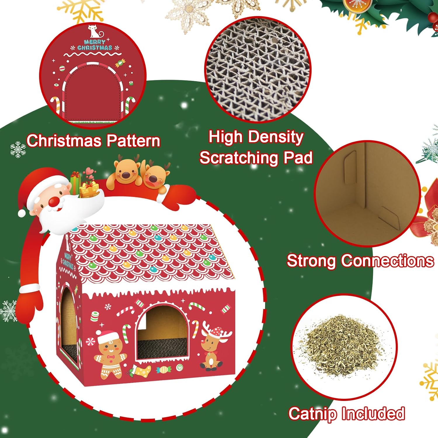Casa rascador para gatos navideños: Adornada con colores vibrantes y diseños de temporada caprichosos, la casa de cartón para gatos añade un toque festivo a tu decoración navideña mientras mantiene a tu gatito comprometido. Prepárate para que tus amigos peludos se diviertan sin fin en nuestra casa de gatos de Navidad