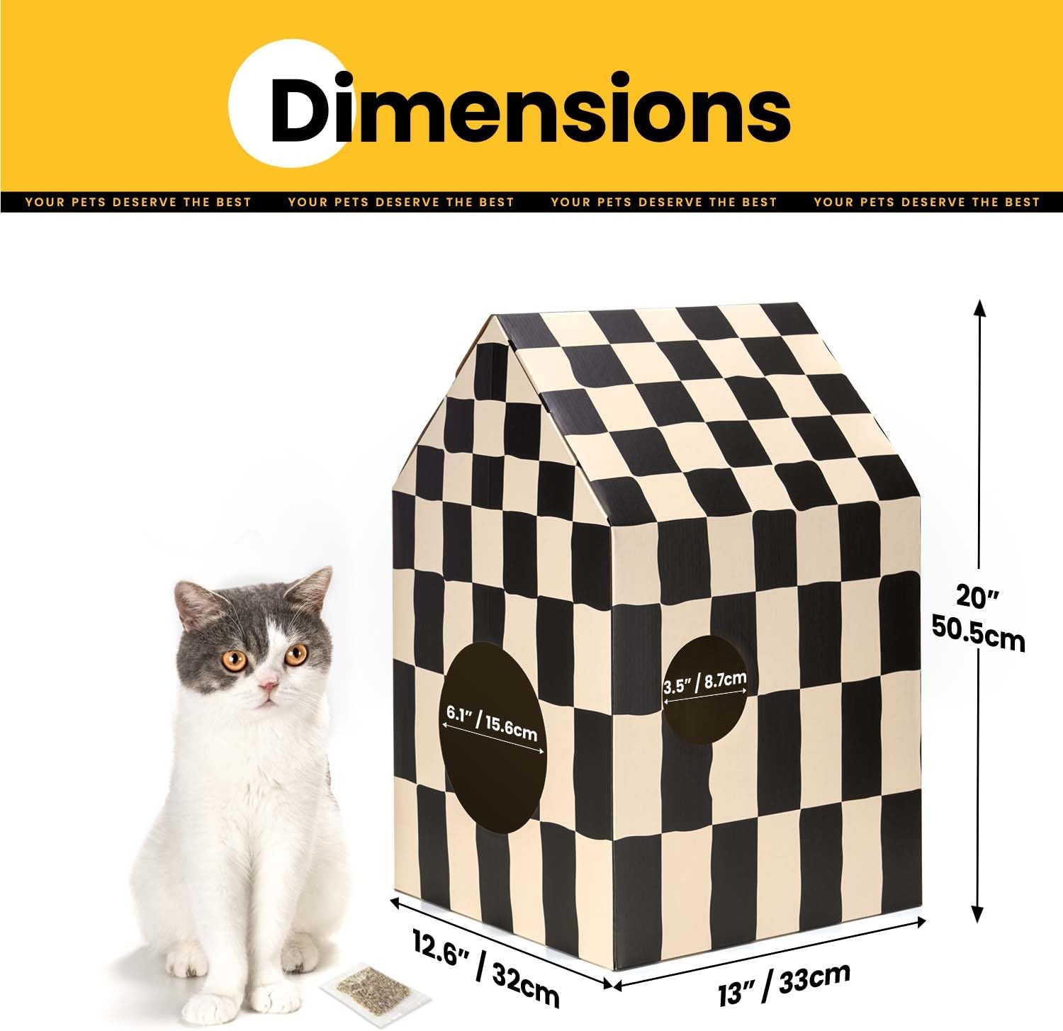 Fácil de instalar Instalación sin esfuerzo, es tan fácil como una brisa. Nuestra casa de cartón para gatos cuenta con un diseño fácil de usar que no requiere herramientas o habilidades intrincadas. Con solo un minuto, puedes crear un refugio acogedor para tu amigo felino. No olvides medir a tu gato para garantizar un ajuste perfecto. Nuestra casa de cama de cartón para gatitos está diseñada para acomodar gatos que pesan hasta 13 libras/13.2 lbs. Referencia de tamaño: 13 pulgadas de largo x 12.6 pulgadas de ancho x 20 pulgadas de alto.