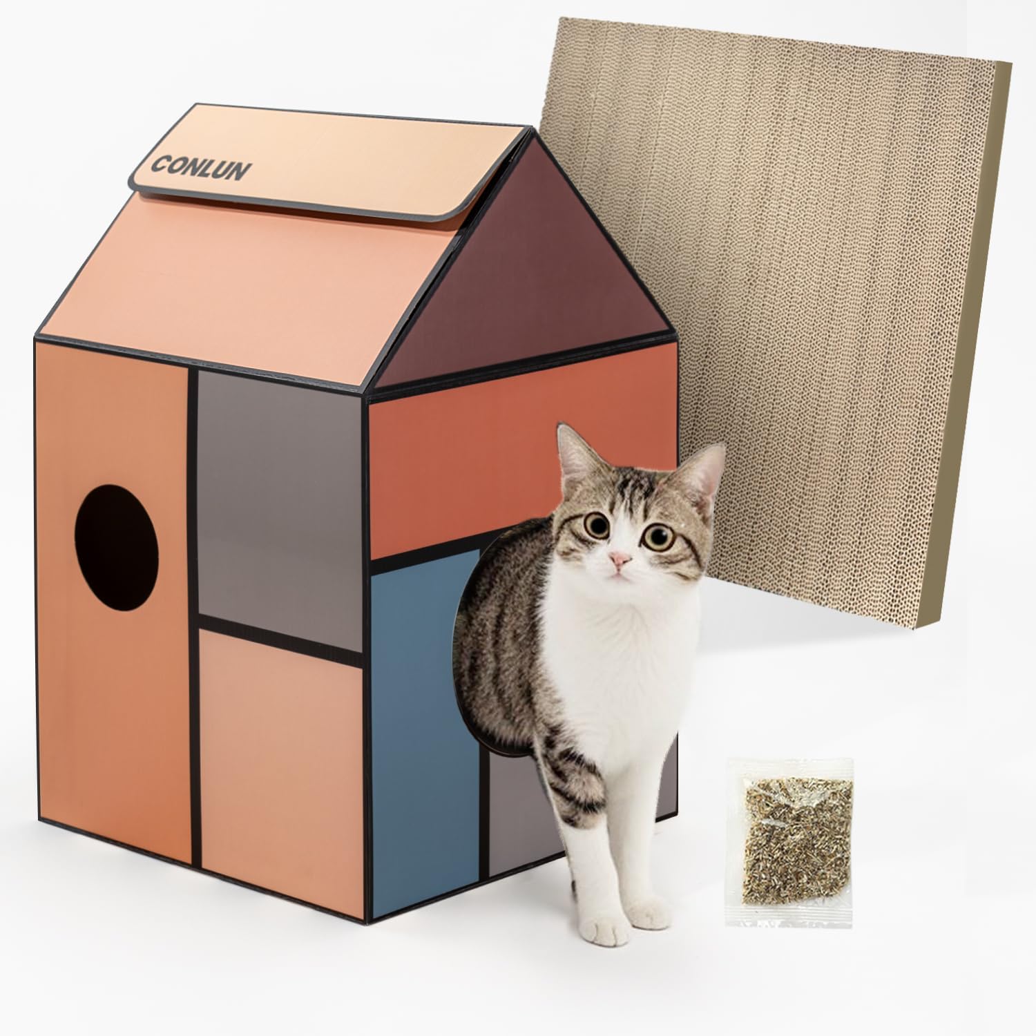 Combinación de decoración ideal Rechaza lo ordinario. Descubre nuestra adorable casa rascador de cartón para gatos en tres estilos encantadores, que combinan perfectamente con la decoración de tu hogar. Diseñado pensando en la singularidad, la casa de almohadillas para rascar para gatos ofrece un espacio acogedor para que tus compañeros peludos jueguen y descansen. Ya sea una siesta rápida o una aventura animada, la casa rascador de gatos Conlun es su lugar de referencia. Elige la casa para gatos Conlun con hierba gatera para una adición encantadora a tu hogar y un refugio especial para tu querido gatito