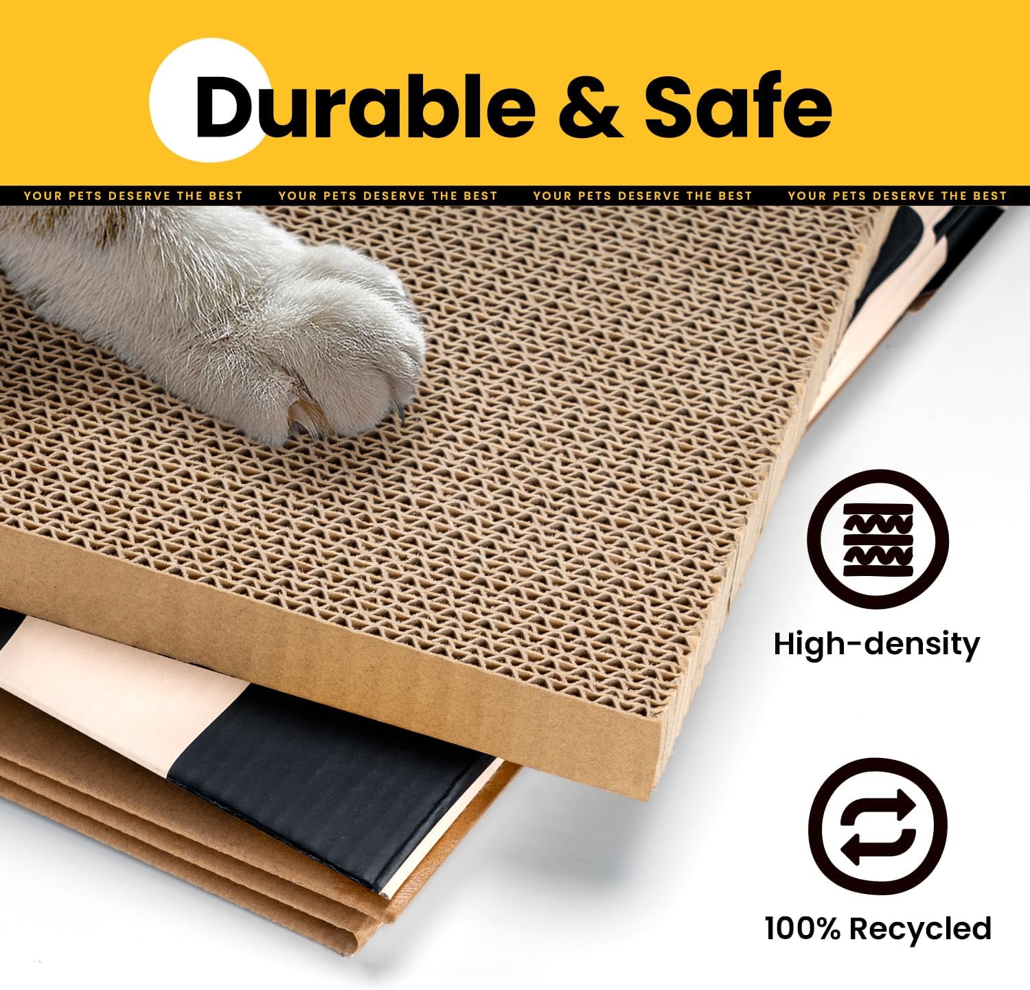 Material 100% natural: eleva la calidad de vida de tu gato con nuestros rascadores únicos para gatos de interior Está hecho de cartón corrugado resistente y 100% reciclado, asegurando un ambiente seguro y no tóxico para tu compañero felino. Utilizamos inteligentemente pegamento a base de almidón de maíz para garantizar que cada detalle sea seguro y confiable. Deja que tu gato se deleite a rascarse y jugar en este entorno seguro, disfrutando de momentos sin preocupaciones