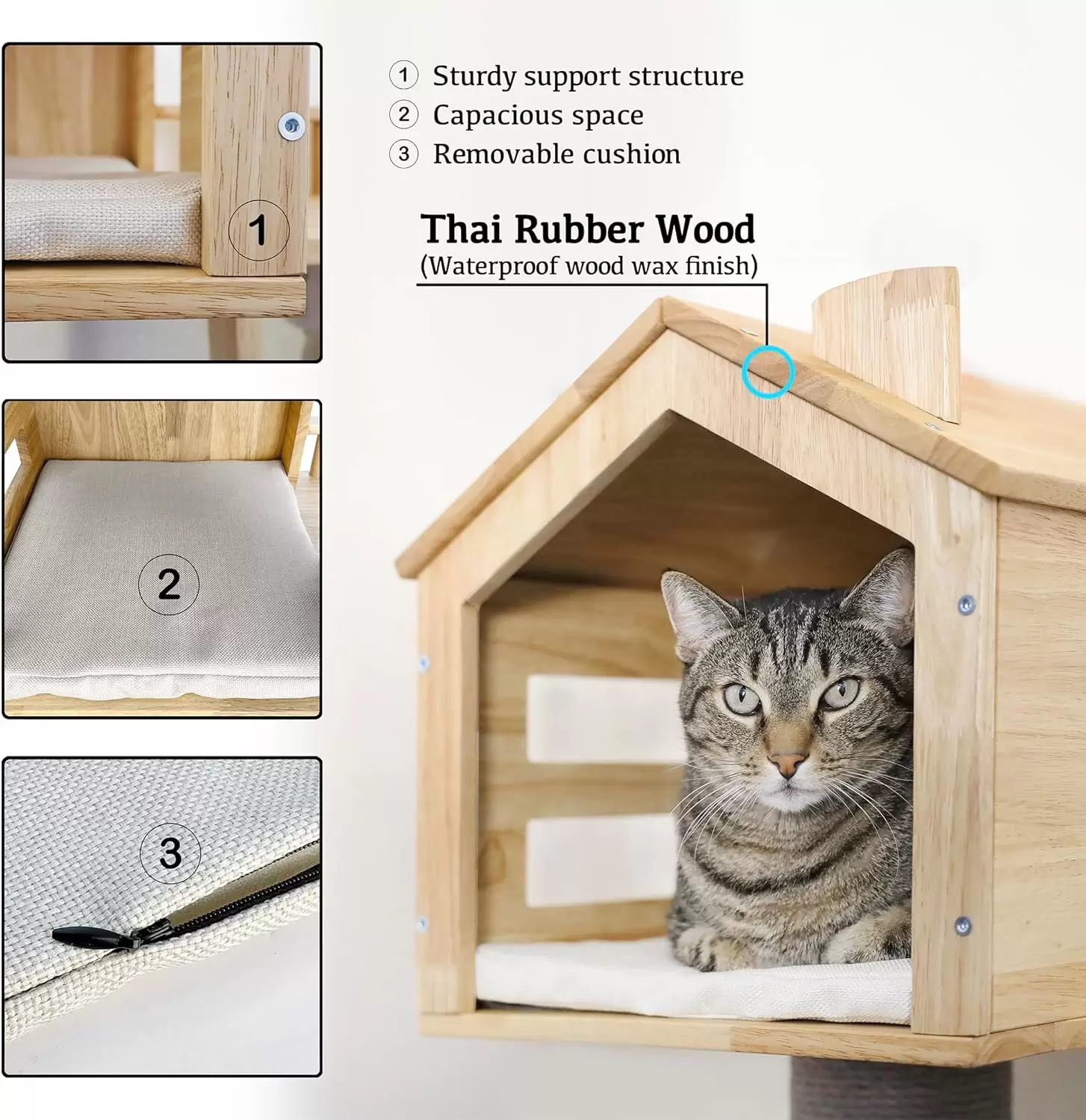 Casa de madera premium para gatos con acabado impermeable y rascador de sisal. Madera de goma tailandesa sin olores. Facil de armar y limpiar. Ideal para proteger muebles.