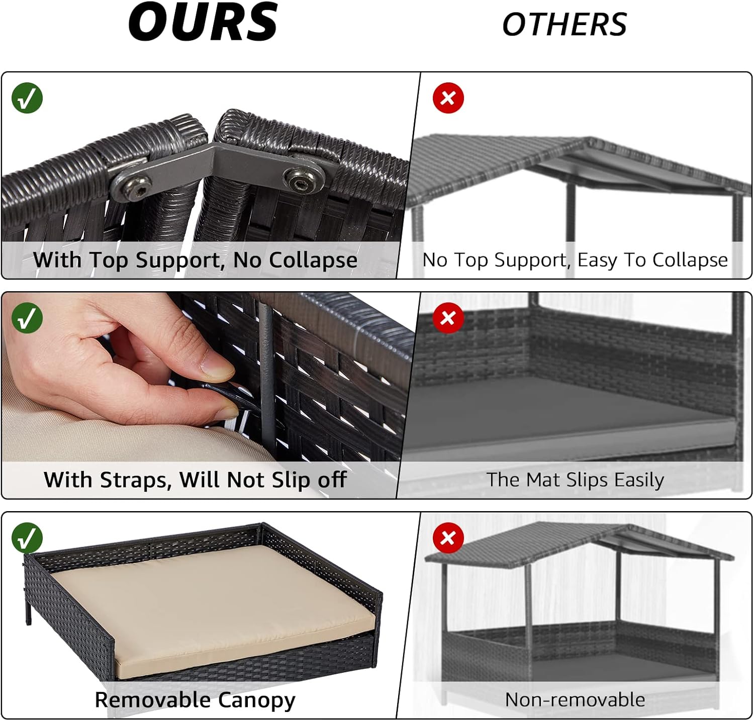 Parte superior extraíble: la parte superior de esta cama de mimbre para mascotas es extraíble, por lo que puedes elegir utilizar una cama convertible o una cama con dosel con sombra, para que tu cachorro pueda disfrutar del calor del sol y sentir la sombra.