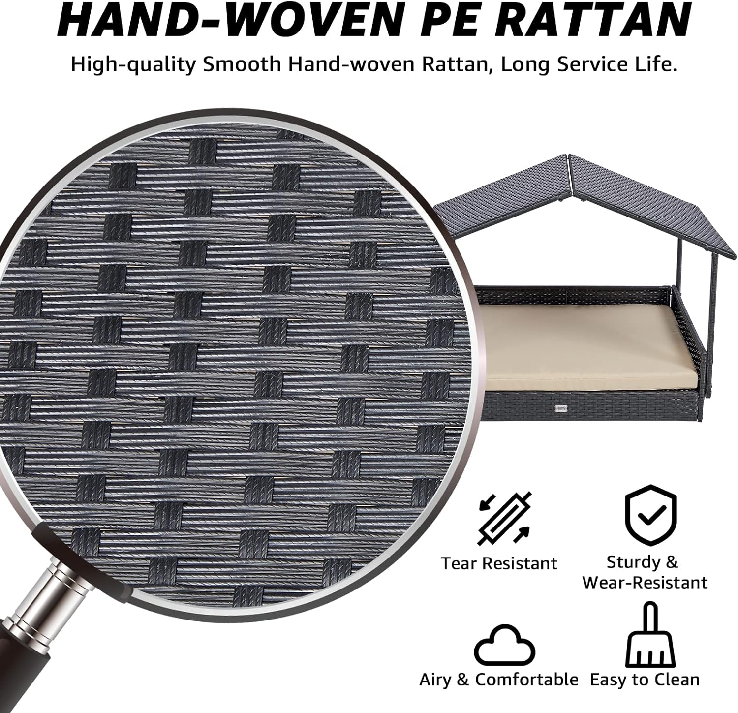 Resistente y construcción: hecha de ratán de alta calidad, que es impermeable, transpirable y resistente a las masticaciones, nuestra casa elevada para perros permanecerá con tu mascota durante más tiempo. La casa para perros se compone de un marco de acero resistente que hace que la casa del perro sea menos propensa a temblar. También cuenta con un fondo elevado para una buena ventilación.