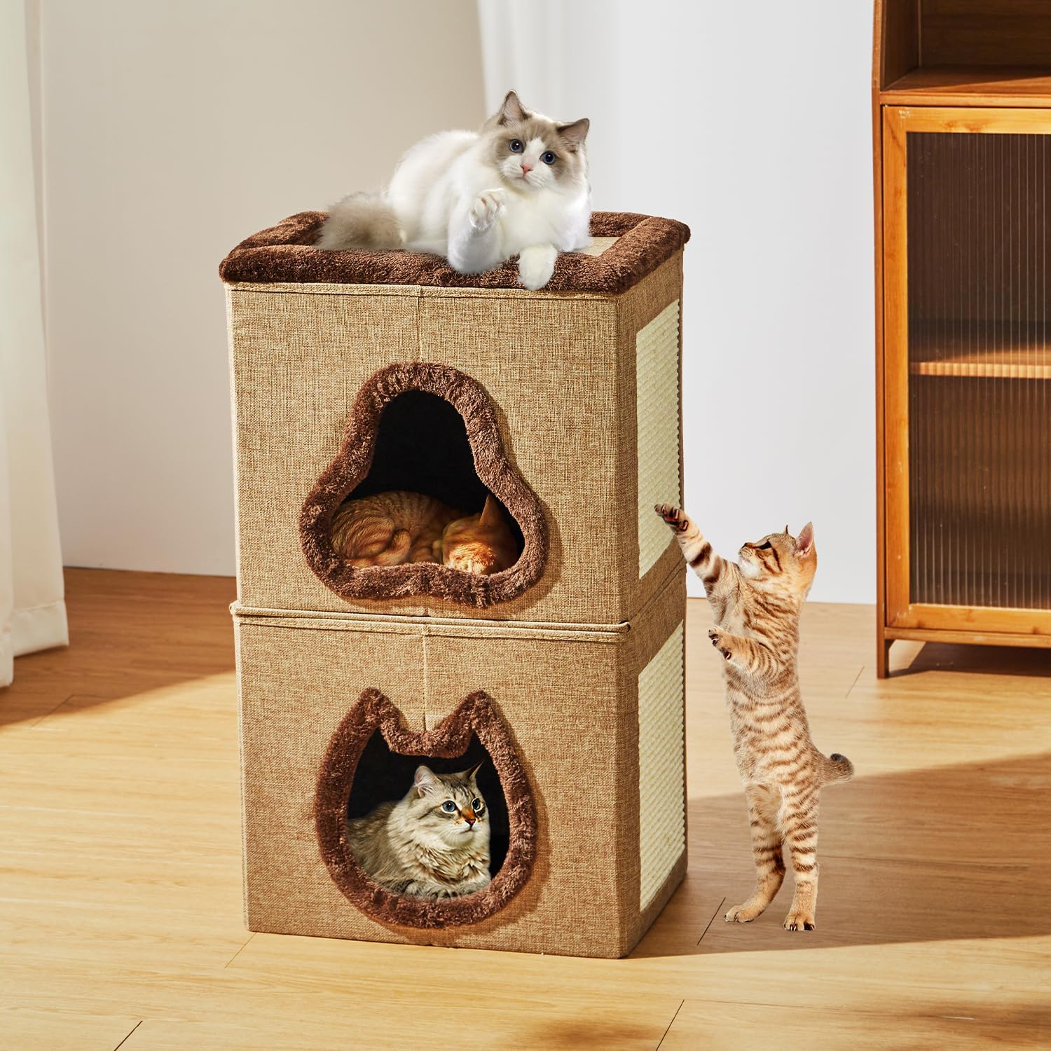 Cama para gatos de 3 niveles: la casa para gatos proporciona 2 niveles de escondites espaciosos para que los gatos se escondan, jueguen y descansen, con un nivel superior que les permite tomar una siesta o mirar por la ventana. Las camas para gatos de interior proporcionan a tus gatos una fuerte sensación de seguridad y mucho espacio, ideal para hogares con varios gatos