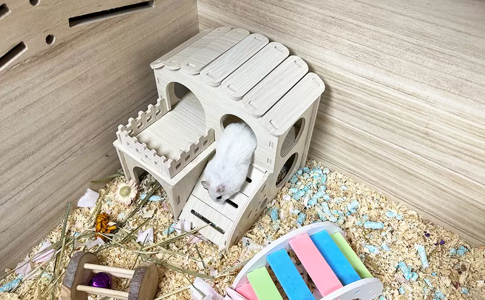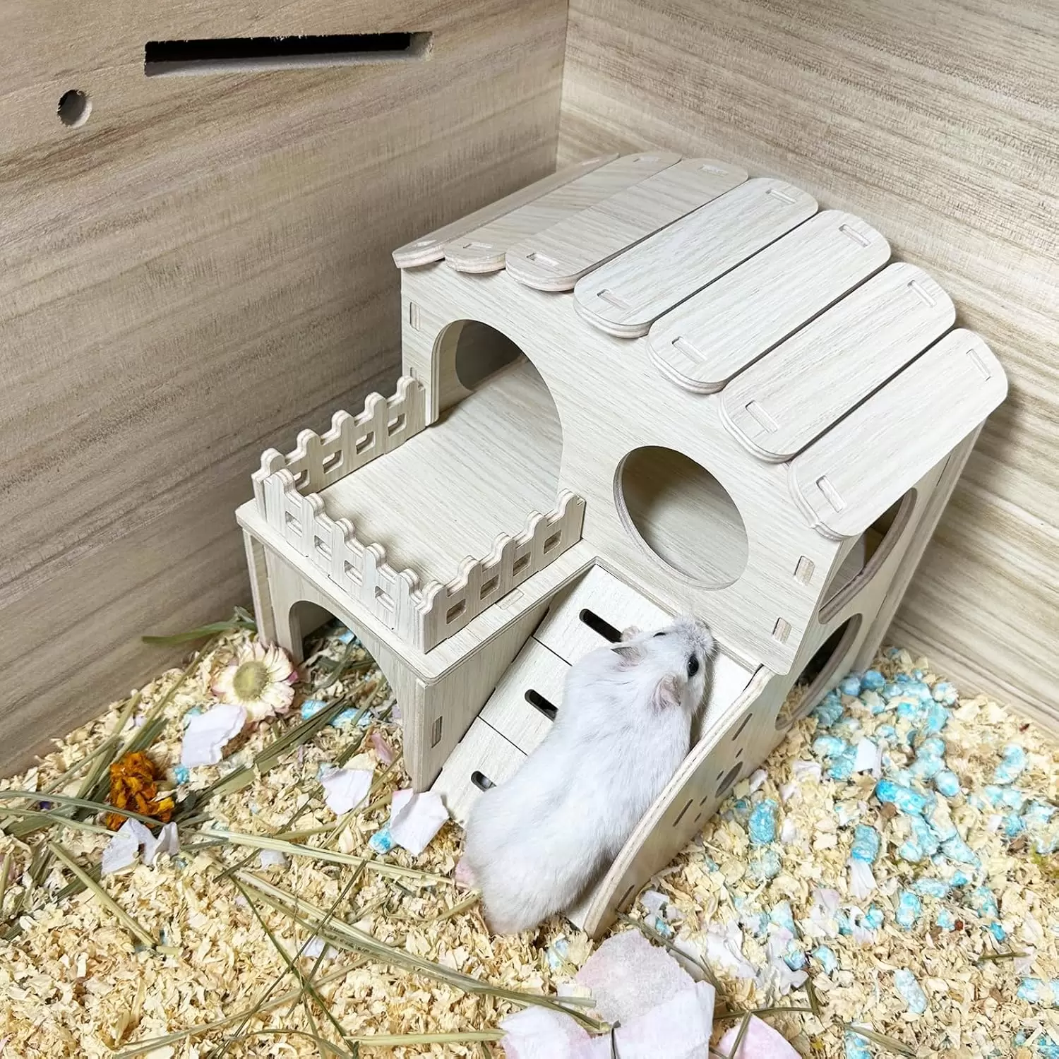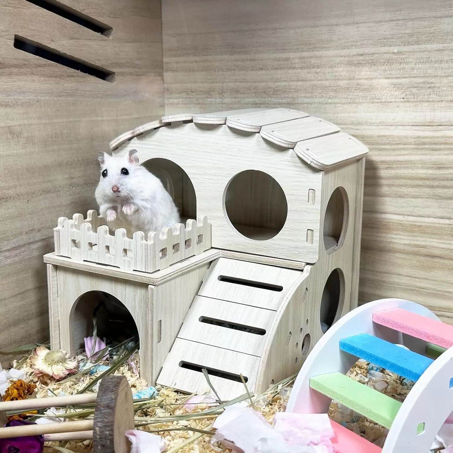 Muy cómodo y seguro: los bordes y esquinas de la casa de hámster se manejarán con anticipación para evitar lesiones de mascotas. Nuestras cabañas de hámster de dos pisos proporcionan un refugio seguro para tu mascota, con colores originales de madera que se pueden proteger en jaulas de hámster, mejorando el valor ornamental de la jaula.