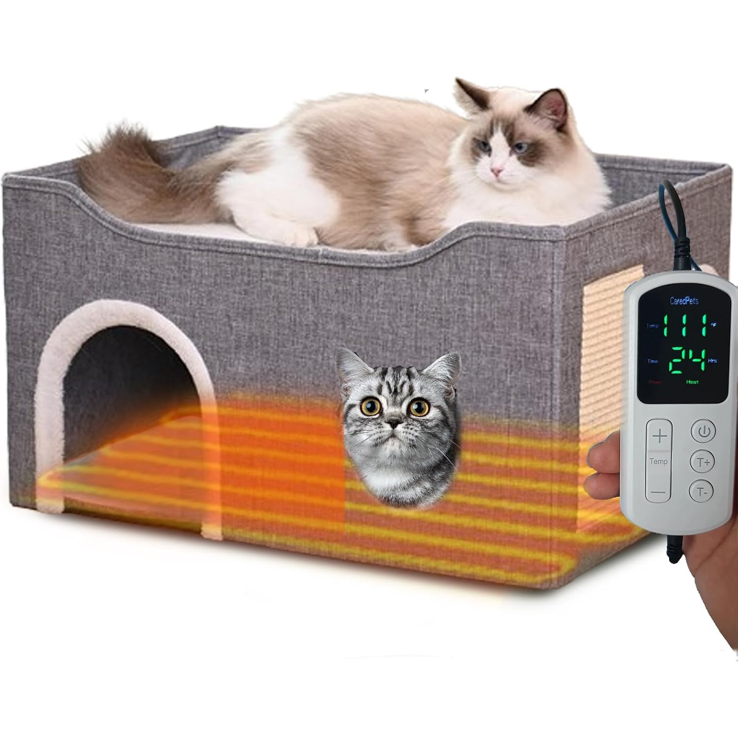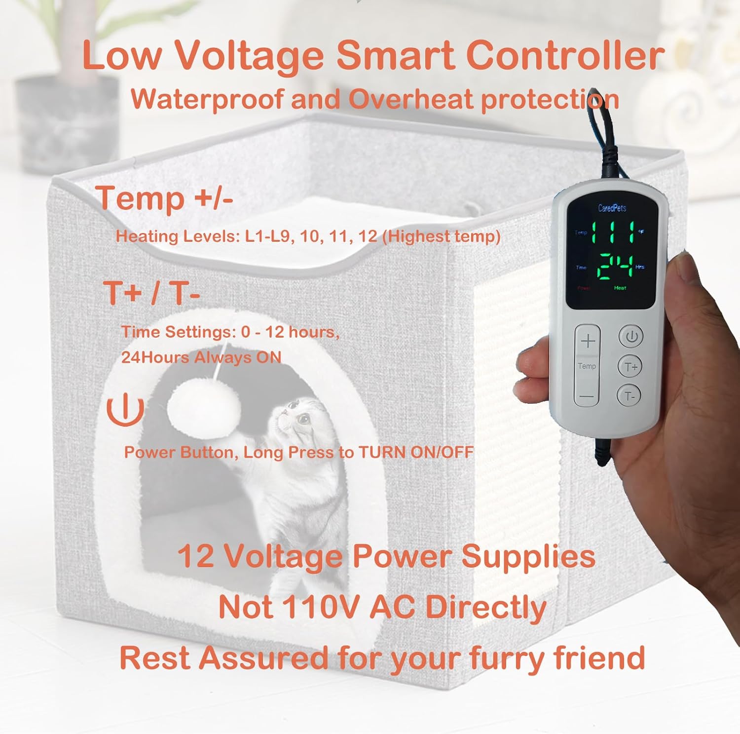 Fácil de usar: simplemente conecta el adaptador de corriente y la almohadilla térmica, luego selecciona el nivel de temperatura y el ajuste de tiempo deseados. El termostato integrado garantiza un nivel de calor constante y cómodo para tu gato durante todo el día y la noche.