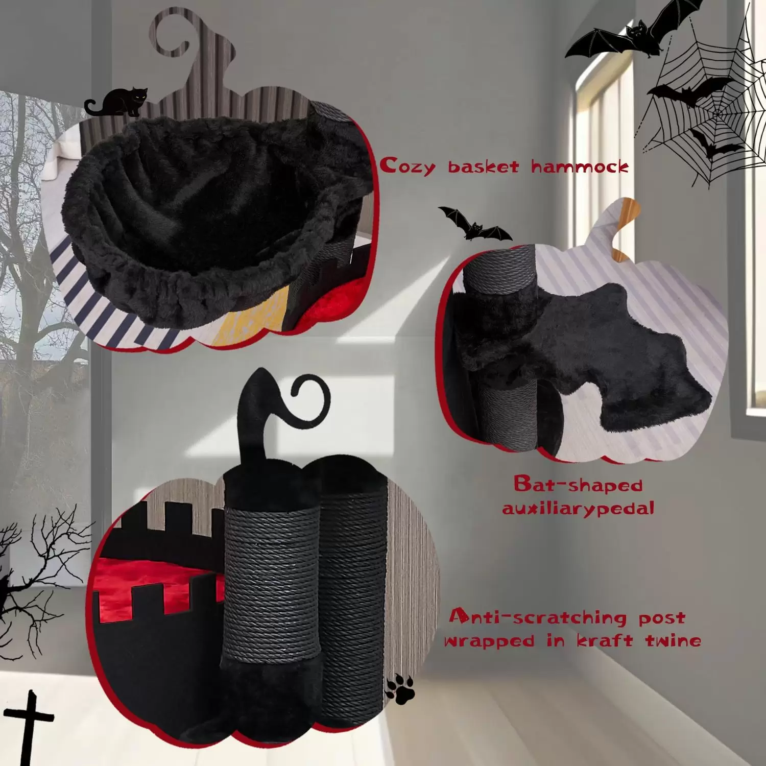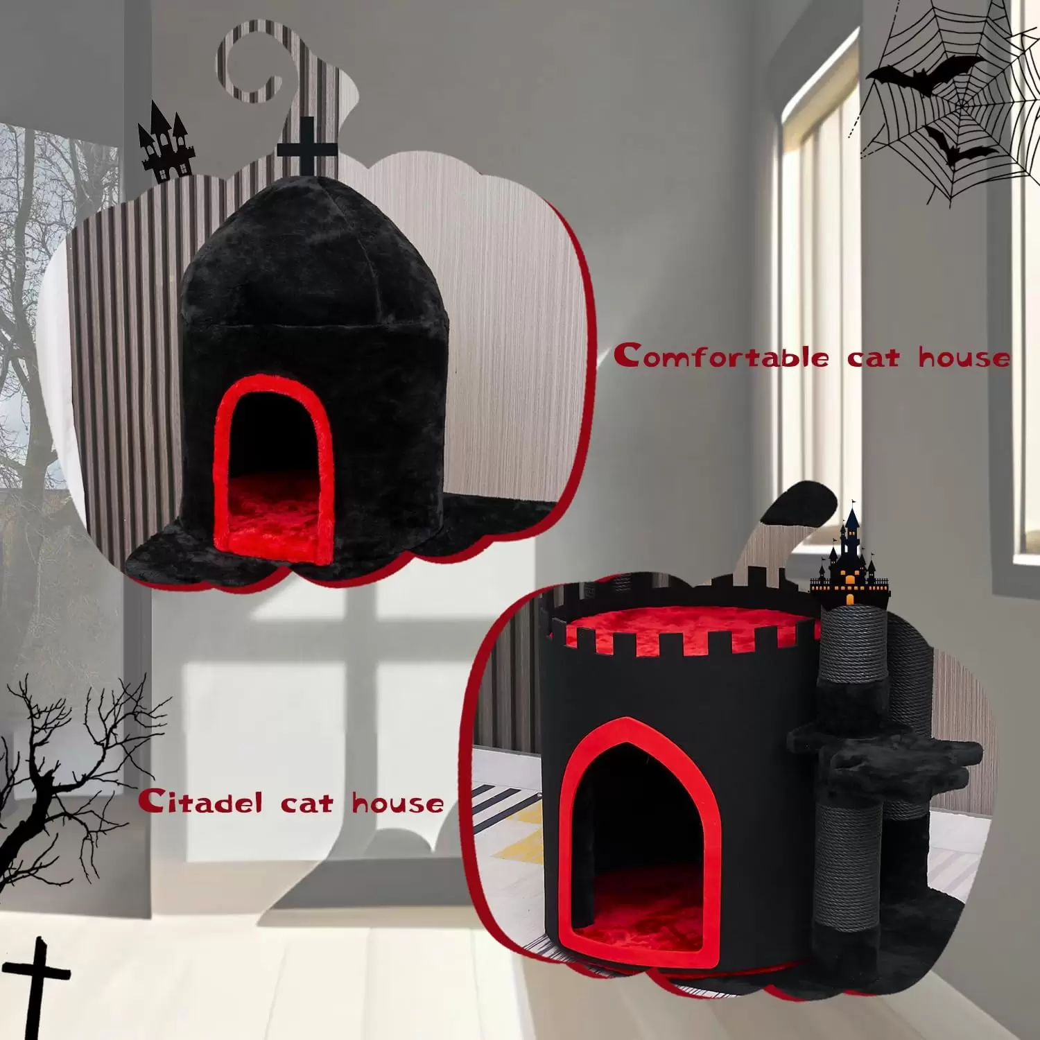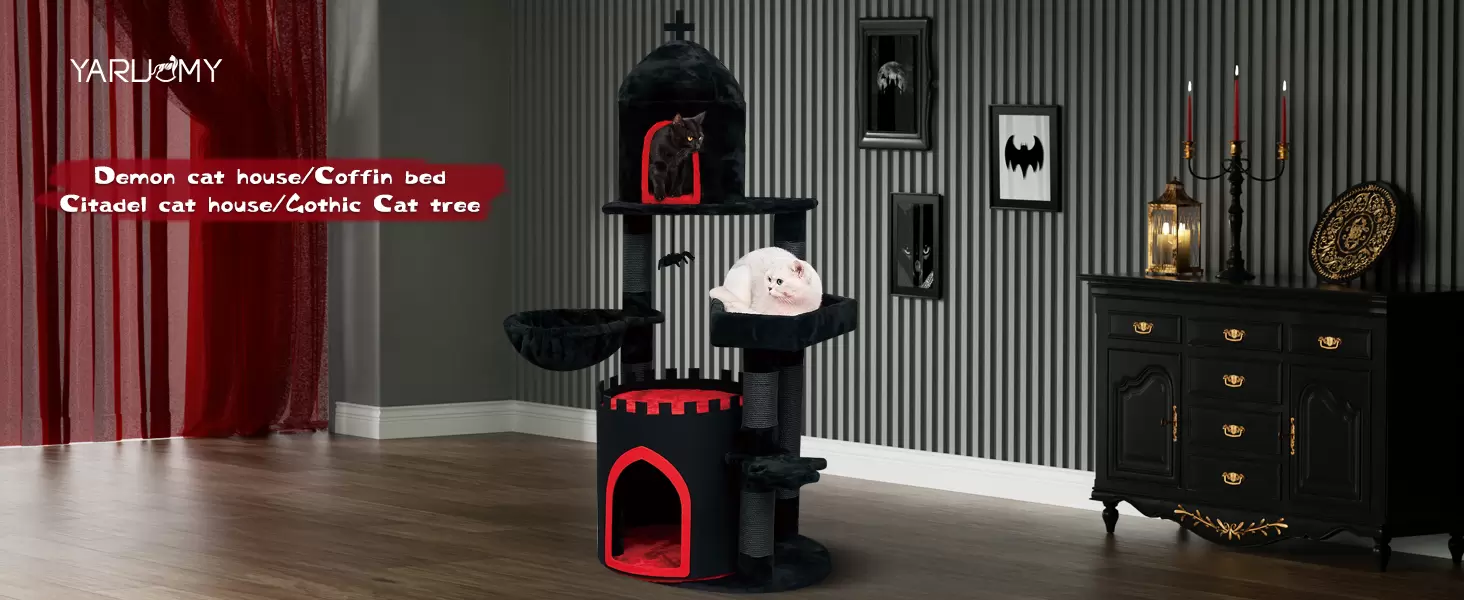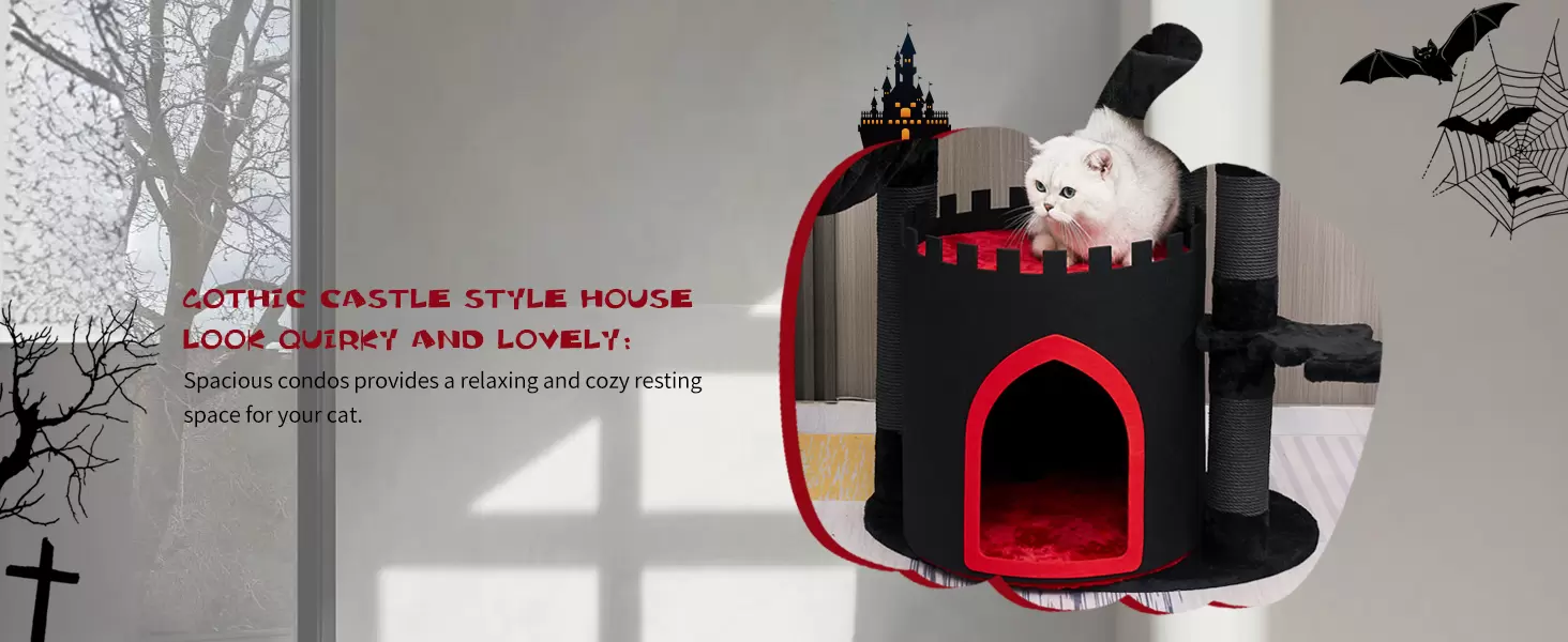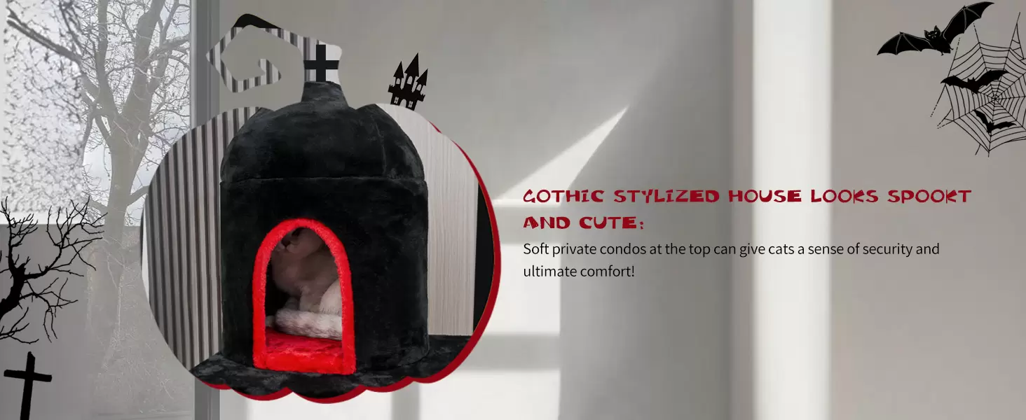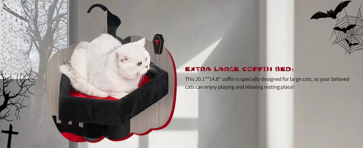 Diseño Temático y Lujo Multi-Piso: Funciona como decoración de Halloween y como torre para gatos durante todo el año. Incluye dos condominios, camas tipo ataúd y plataformas. La espuma de alta densidad garantiza una comodidad duradera para gatos grandes. La construcción de varios pisos garantiza que cada gato pueda descansar sin ser molestado por otros gatos.