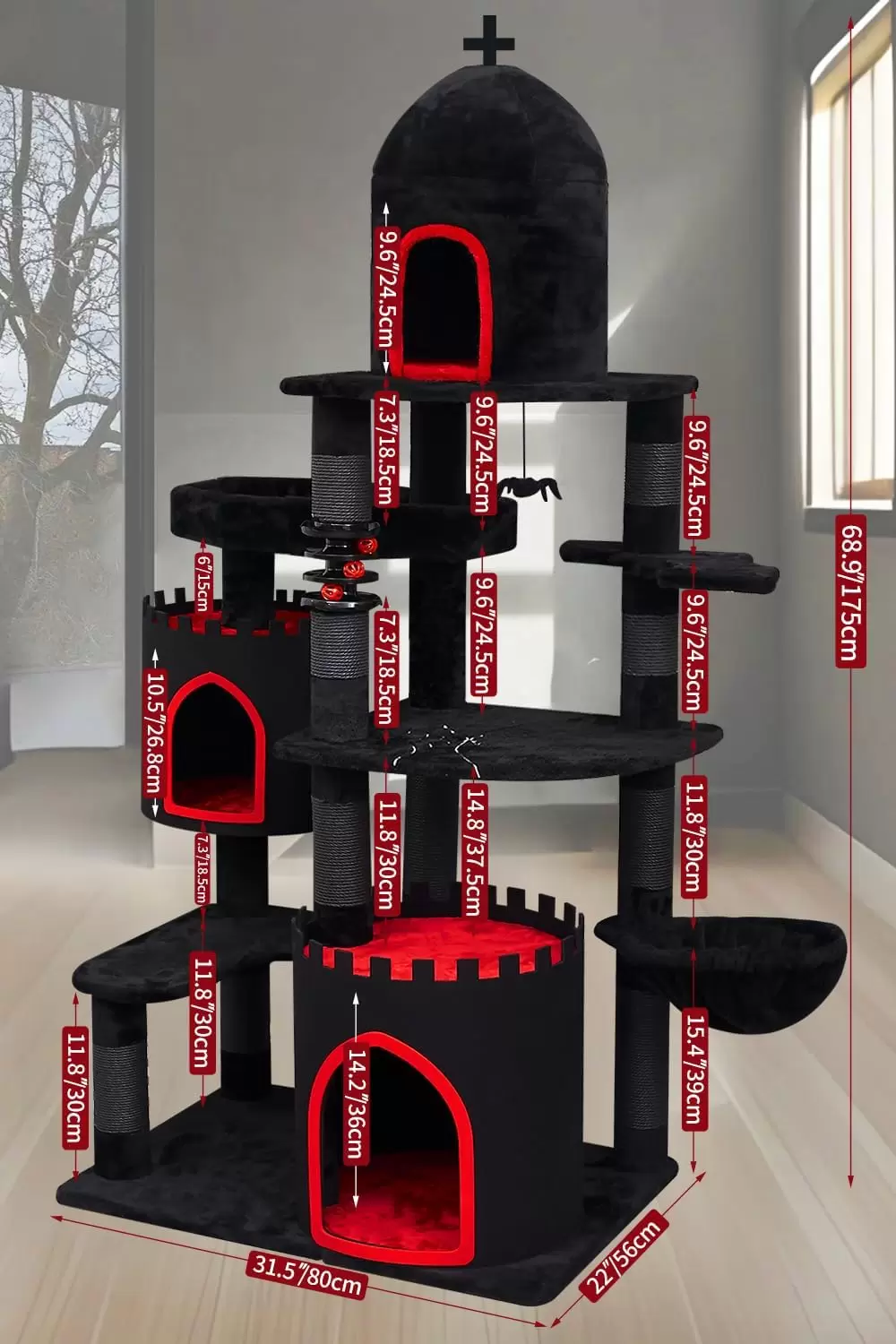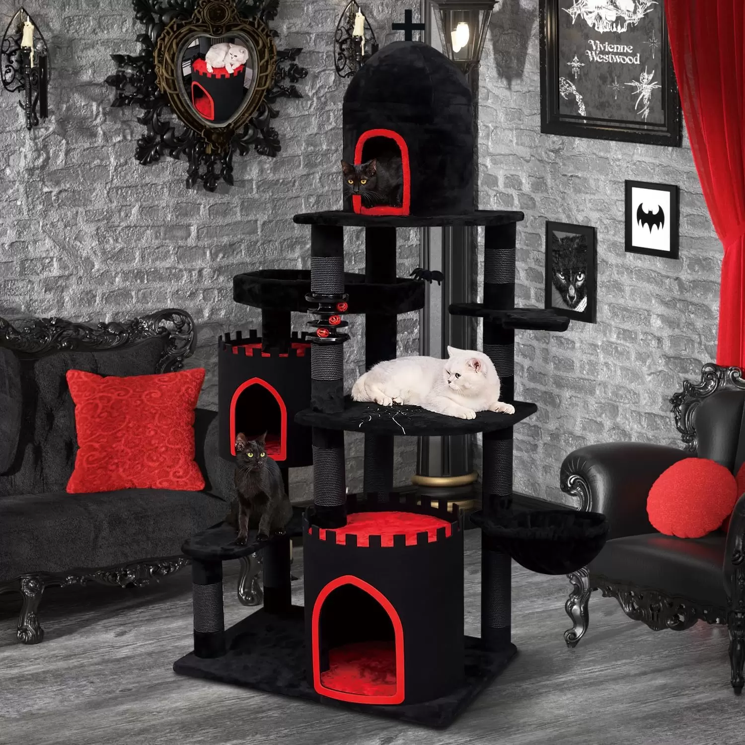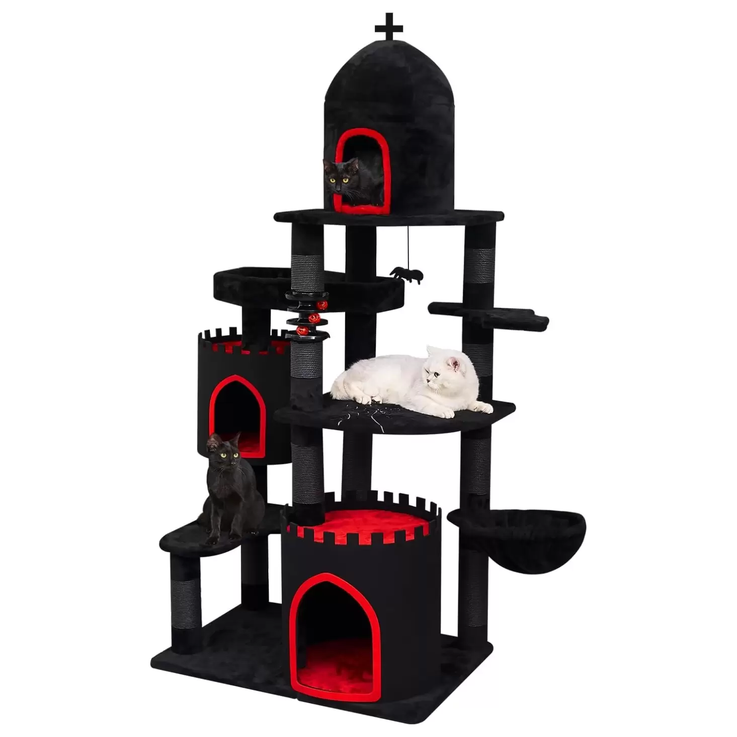 Castillo rascador gótico de 175 cm con tres condominios y cama ataúd. Base extragrande para máxima estabilidad. Diseño lujoso y temático para varios gatos.