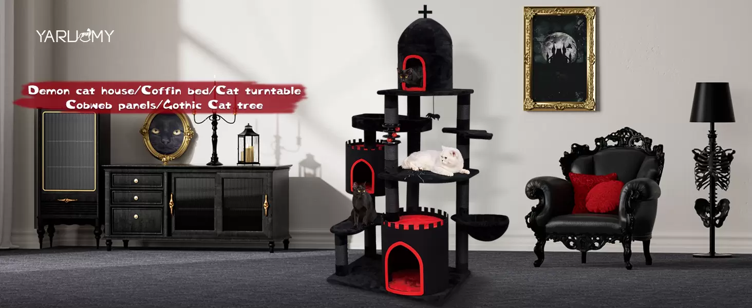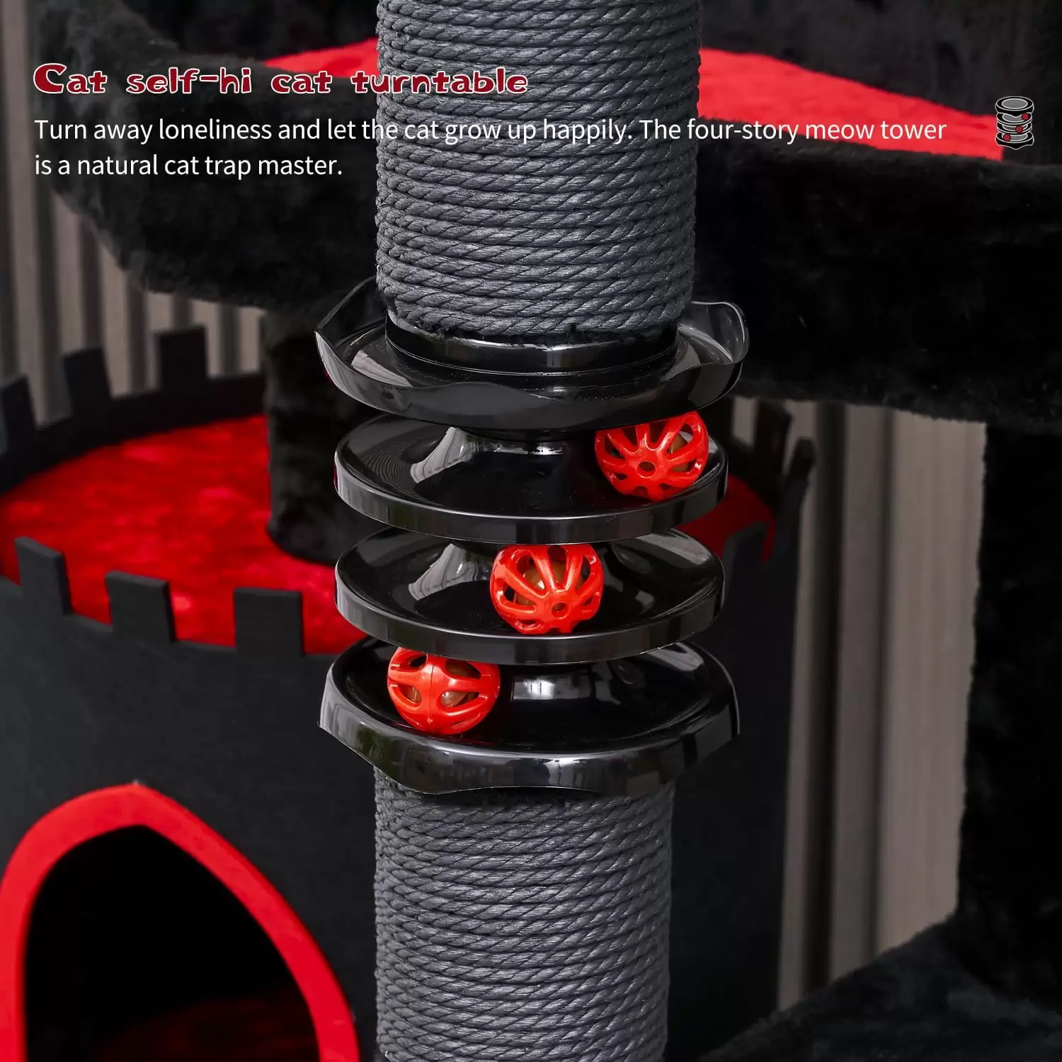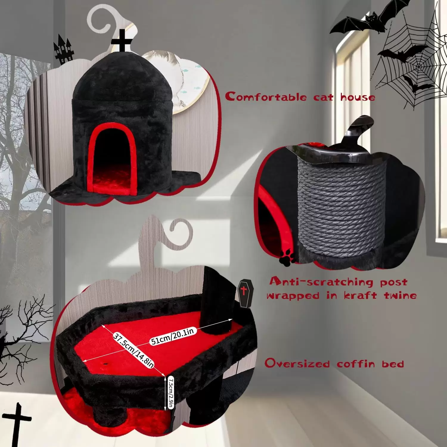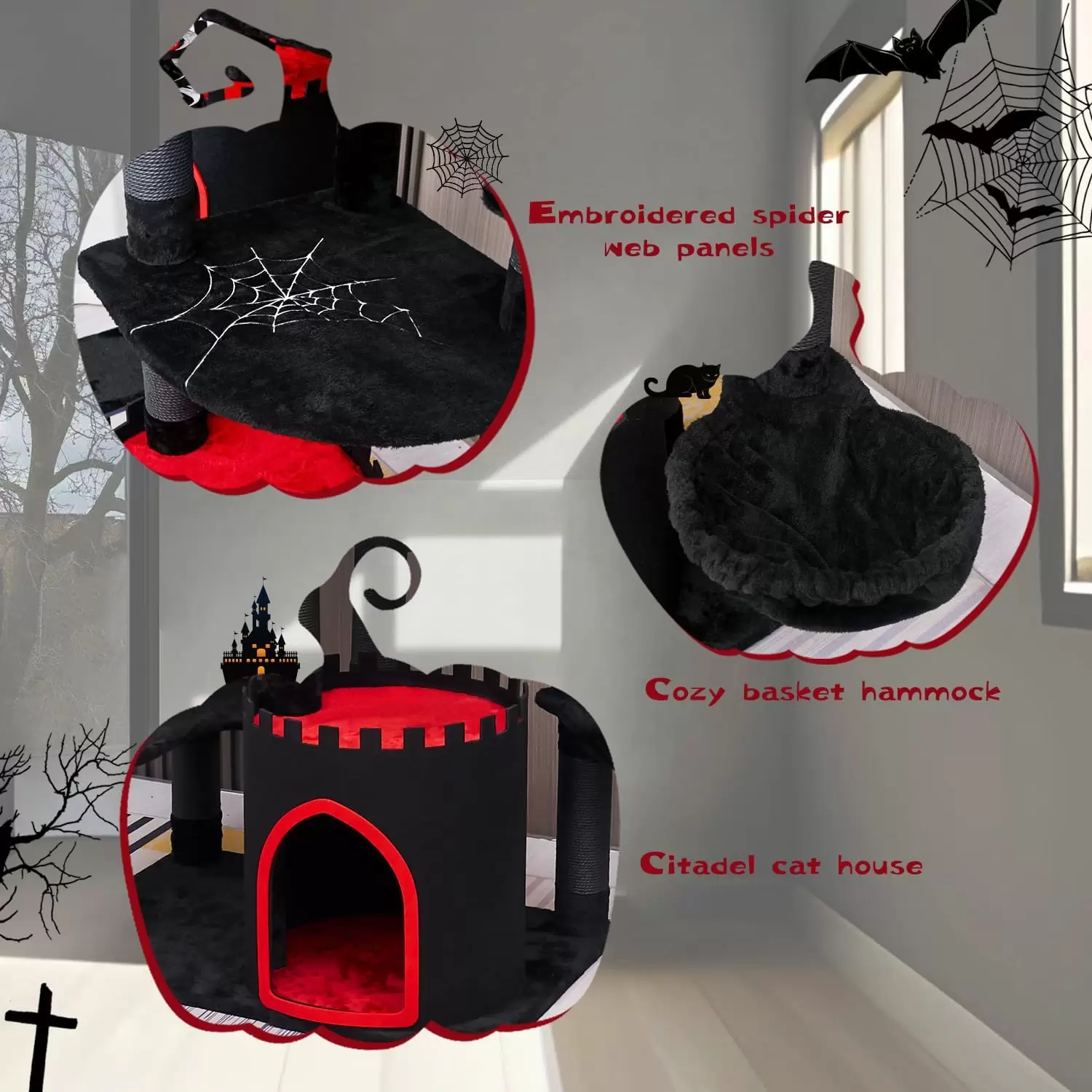 Castillo rascador gótico de 175 cm con tres condominios y cama ataúd. Base extragrande para máxima estabilidad. Diseño lujoso y temático para varios gatos.