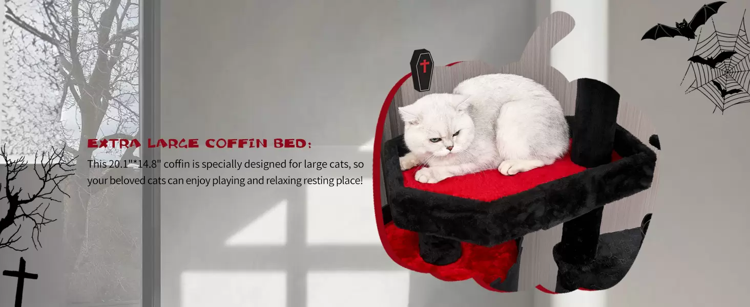 Torre de Lujo Multi-Piso: La construcción de varios pisos garantiza que los gatos no sean molestados por otros mientras descansan. Refugios VIP: Incluye tres condominios, camas tipo ataúd, cestas y plataformas. Confort Extremo: La cama del ataúd y los condominios tienen almohadillas de esponja muy suaves y cómodas para que sus michis pisen y descansen.