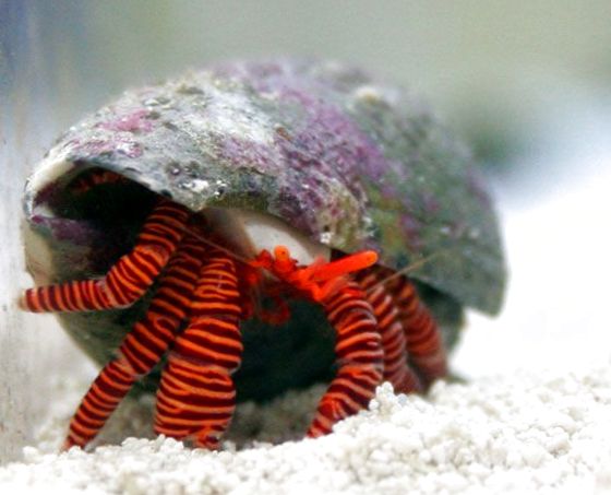 Pequeño cangrejo ermitaño de la zona del caribe, inofensivo de apenas unos 5 centimetros, algivoro y detrivoro y de llamativo color naranja y rayado en negro
