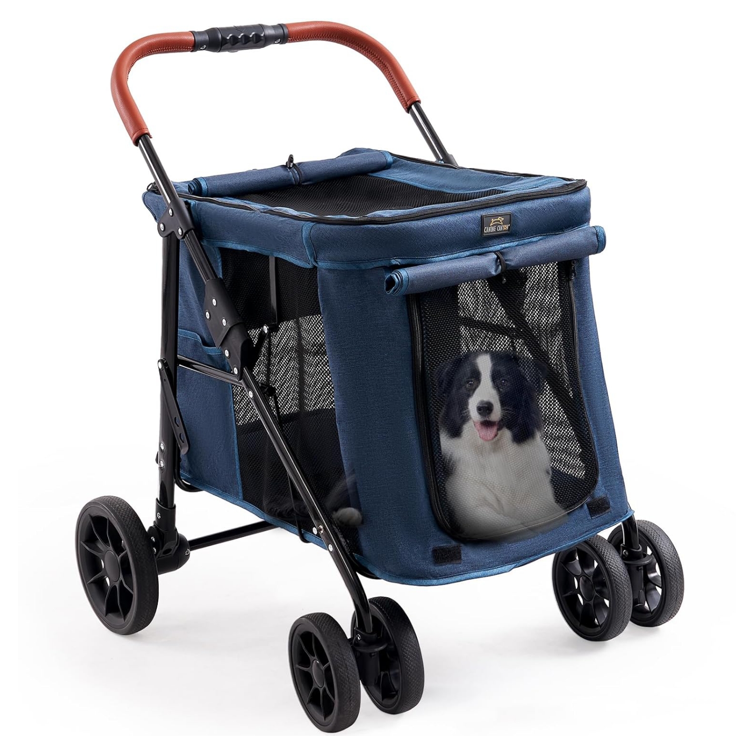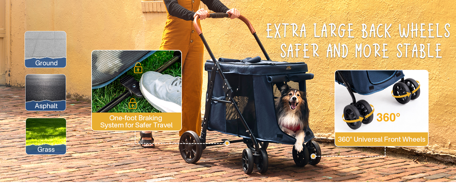 Sistema de cuatro ruedas duradero: el cochecito para mascotas Canine Canyon tiene cuatro ruedas duraderas, con las ruedas delanteras capaces de una rotación flexible de 360 ° y las ruedas traseras de gran tamaño equipadas con un sistema de freno de pie, proporcionando una experiencia de conducción segura y cómoda para tu perro pequeño o mediano.