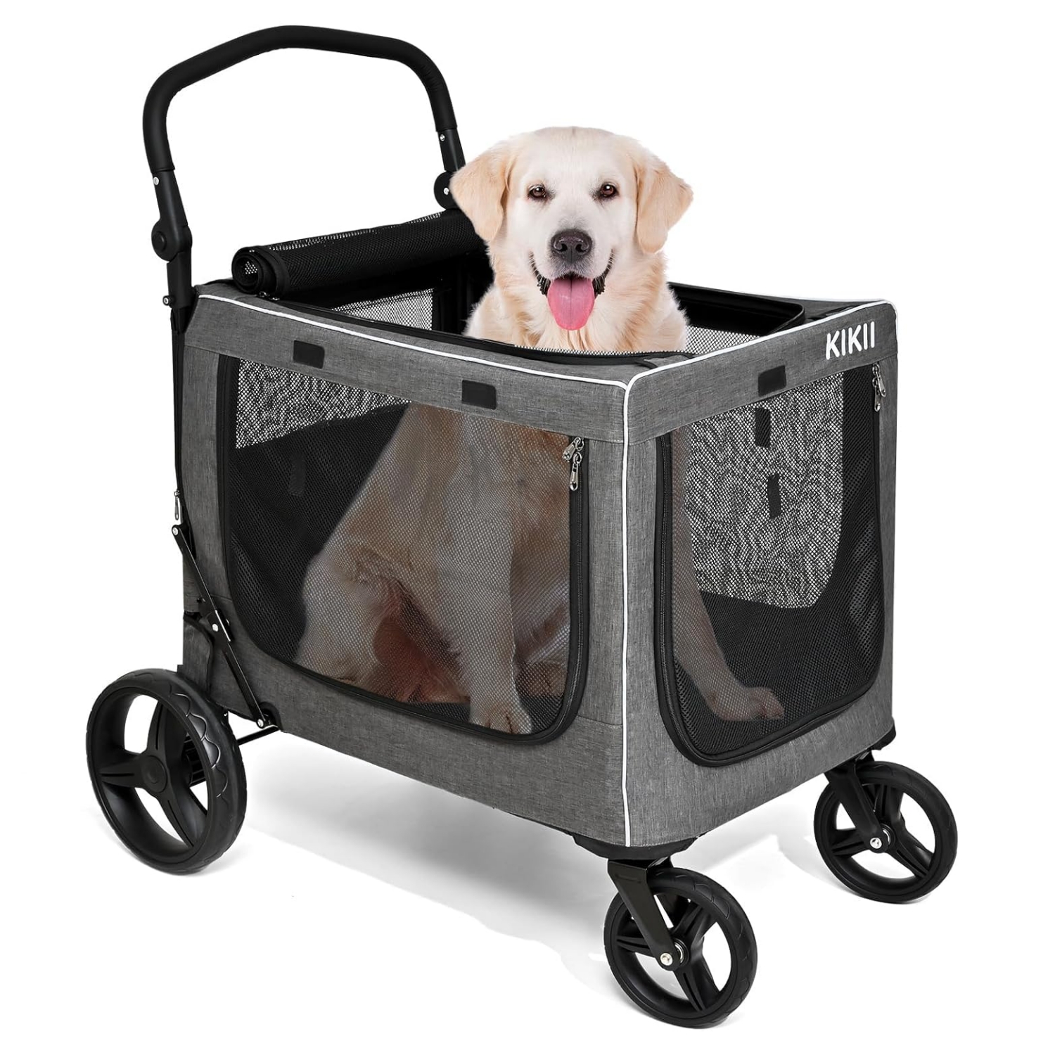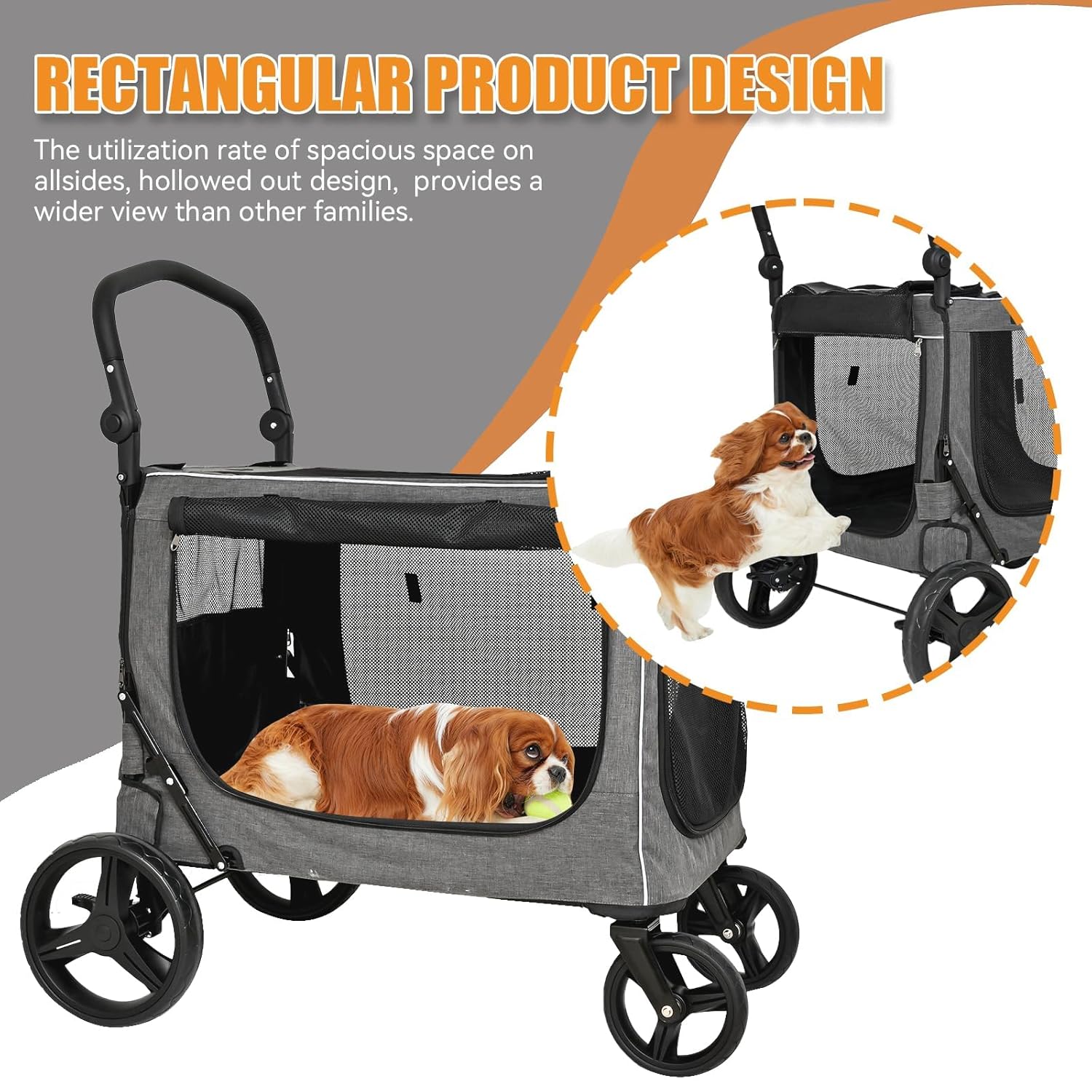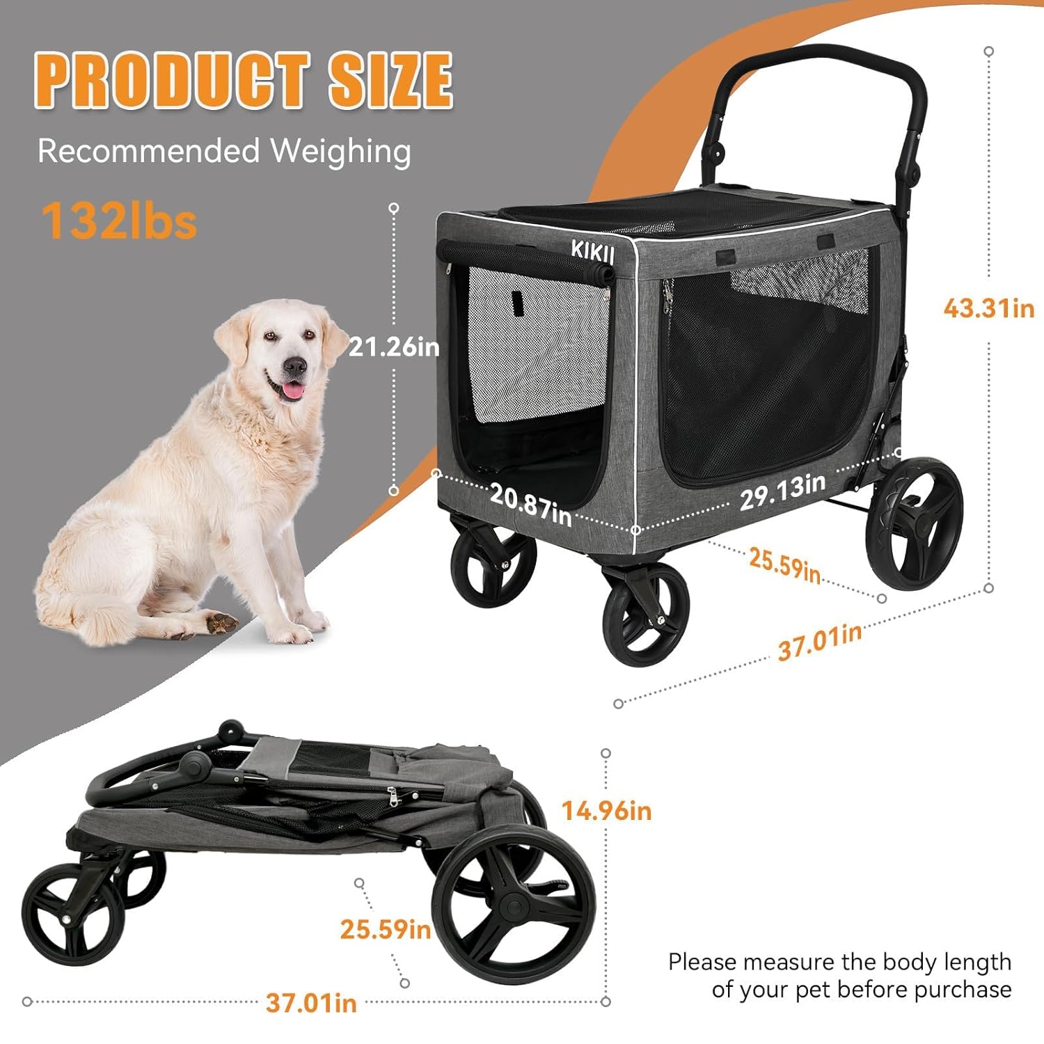Nuestro coche plegable extra grande está diseñado para perros medianos y grandes, ofreciendo un amplio espacio interior de 74 cm de largo x 53 cm de ancho x 54 cm de alto. Tu mascota tendrá libertad para sentarse, acostarse o moverse cómodamente. ¡Ideal para un perro grande o varios pequeños! Perfecto para paseos diarios, aventuras al aire libre, visitas al veterinario o traslados.