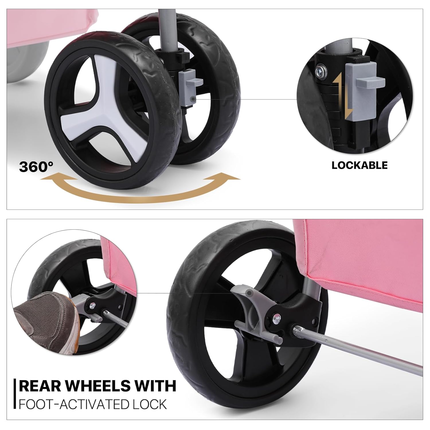 Ruedas flexibles: finalmente, la rueda delantera giratoria de 360° con un amortiguador garantiza que tu mascota tenga un paseo suave incluso en los terrenos más difíciles. Las dos ruedas traseras también cuentan con frenos, lo que hace que este cochecito sea un ajuste perfecto para perros o cachorros lesionados o mayores que necesitan un poco de TLC adicional.