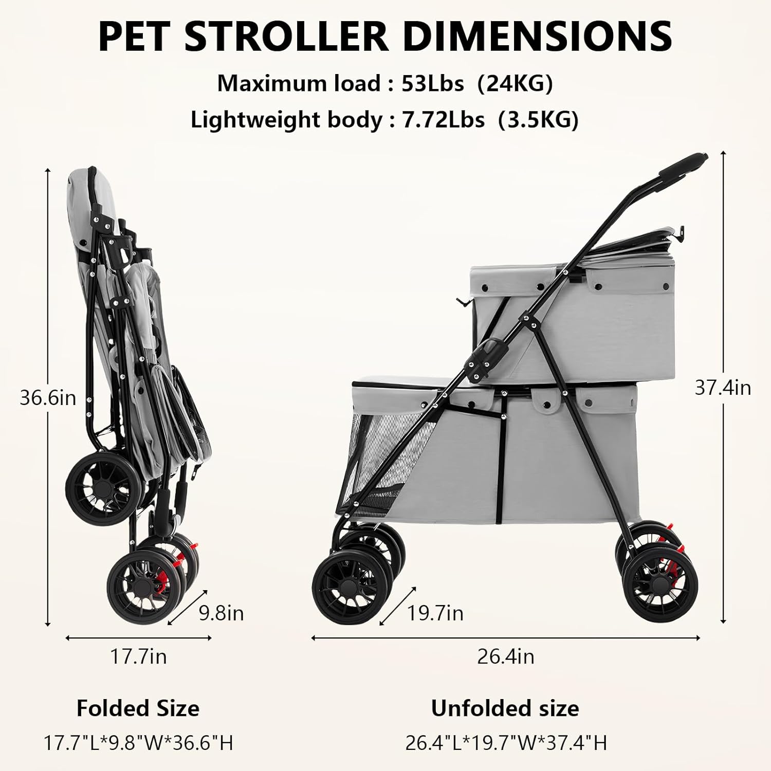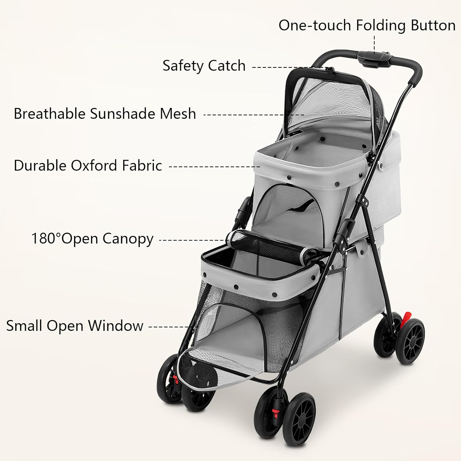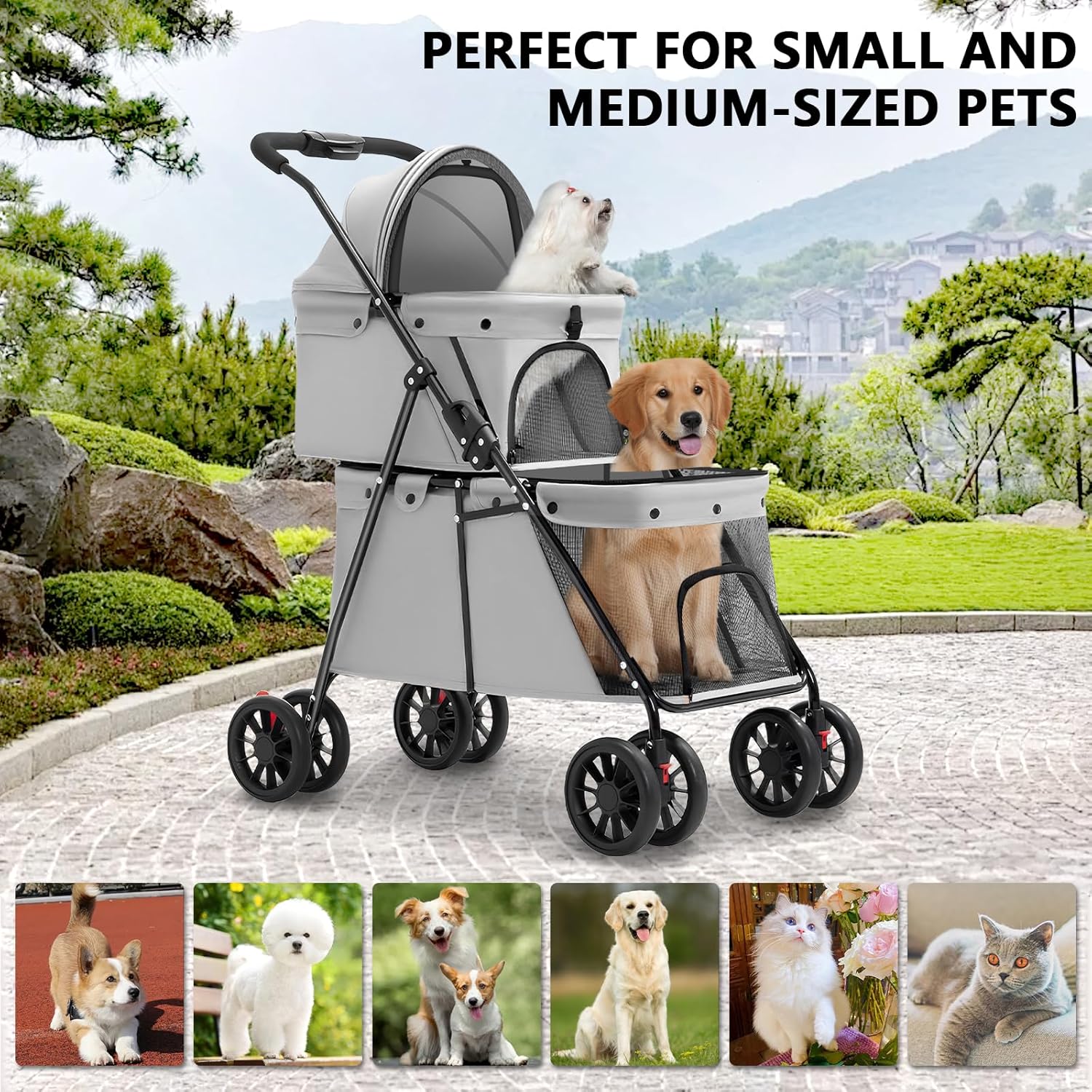 Diseño de doble capa: este cochecito para mascotas tiene dos compartimentos. El espacioso interior puede acomodar dos mascotas pequeñas y medianas al mismo tiempo, así que disfruta de la diversión de los paseos al aire libre con tus mascotas