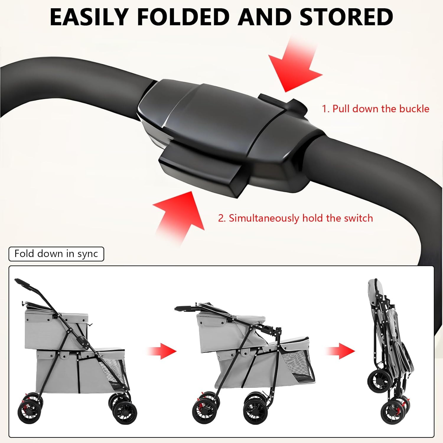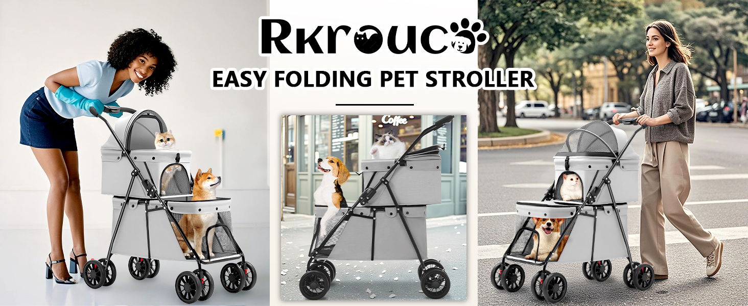 Se monta y dobla fácilmente El cochecito para mascotas Rkrouco solo tarda unos minutos en montarse de forma independiente. También es fácil de plegar, lo que se puede hacer con una mano utilizando el botón en el mango, ahorrando espacio y fácil de almacenar