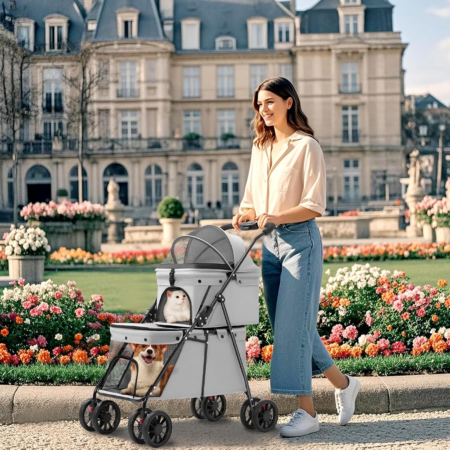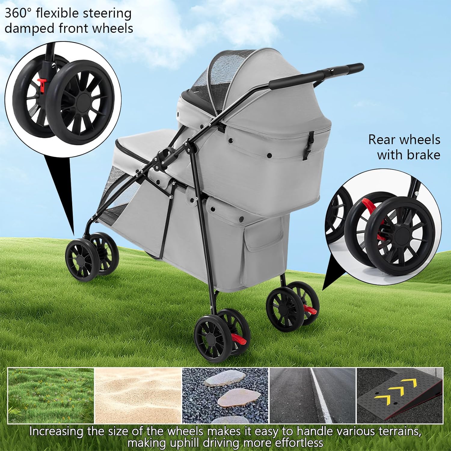 Dirección flexible y amortiguación acolchada Este carrito de paseo para mascotas viene con 4 ruedas duraderas, las ruedas delanteras son autoamortiguables de 360° y las ruedas traseras están equipadas con frenos. La mayor distancia entre ejes combinada con el diseño ligero de la carrocería te permite subir cuesta arriba con menos esfuerzo