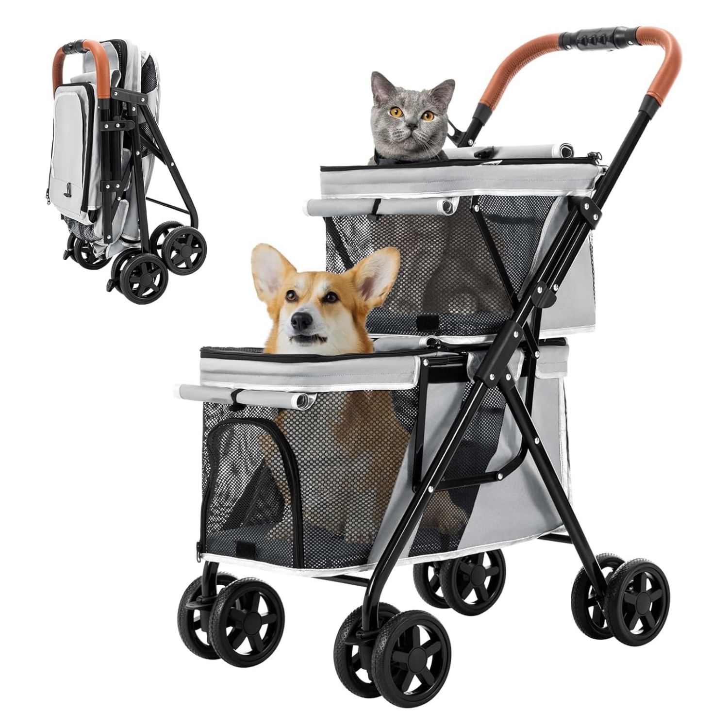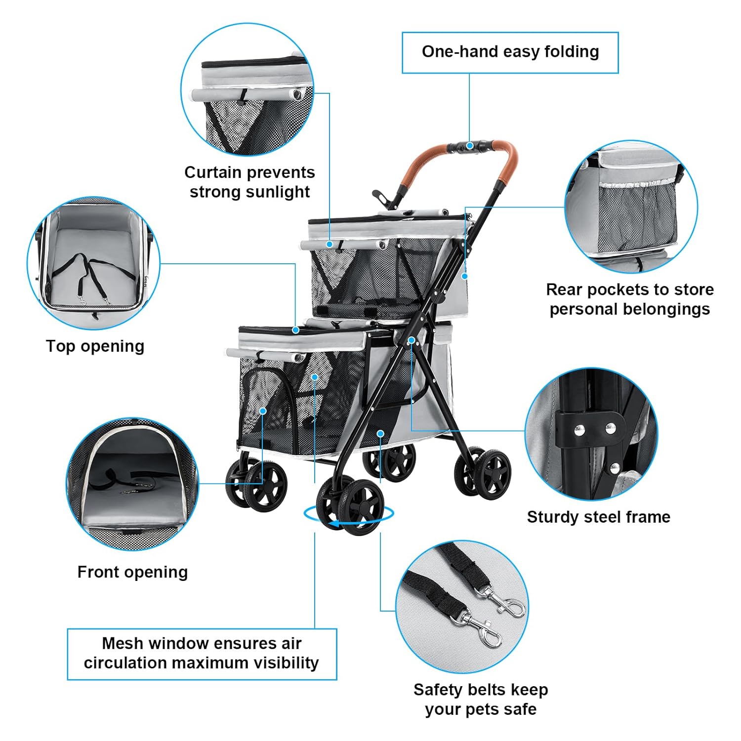 Doble piso para gemelos: duplica la alegría con nuestro diseño de dos plazas. Nuestro cochecito doble para mascotas ofrece dos asientos espaciosos, proporcionando un amplio espacio para que tus mascotas se sienten o se acuesten cómodamente. Ahora puedes llevar a tus compañeros peludos contigo en cada aventura. Déjalos compartir la emoción y crear recuerdos duraderos juntos.