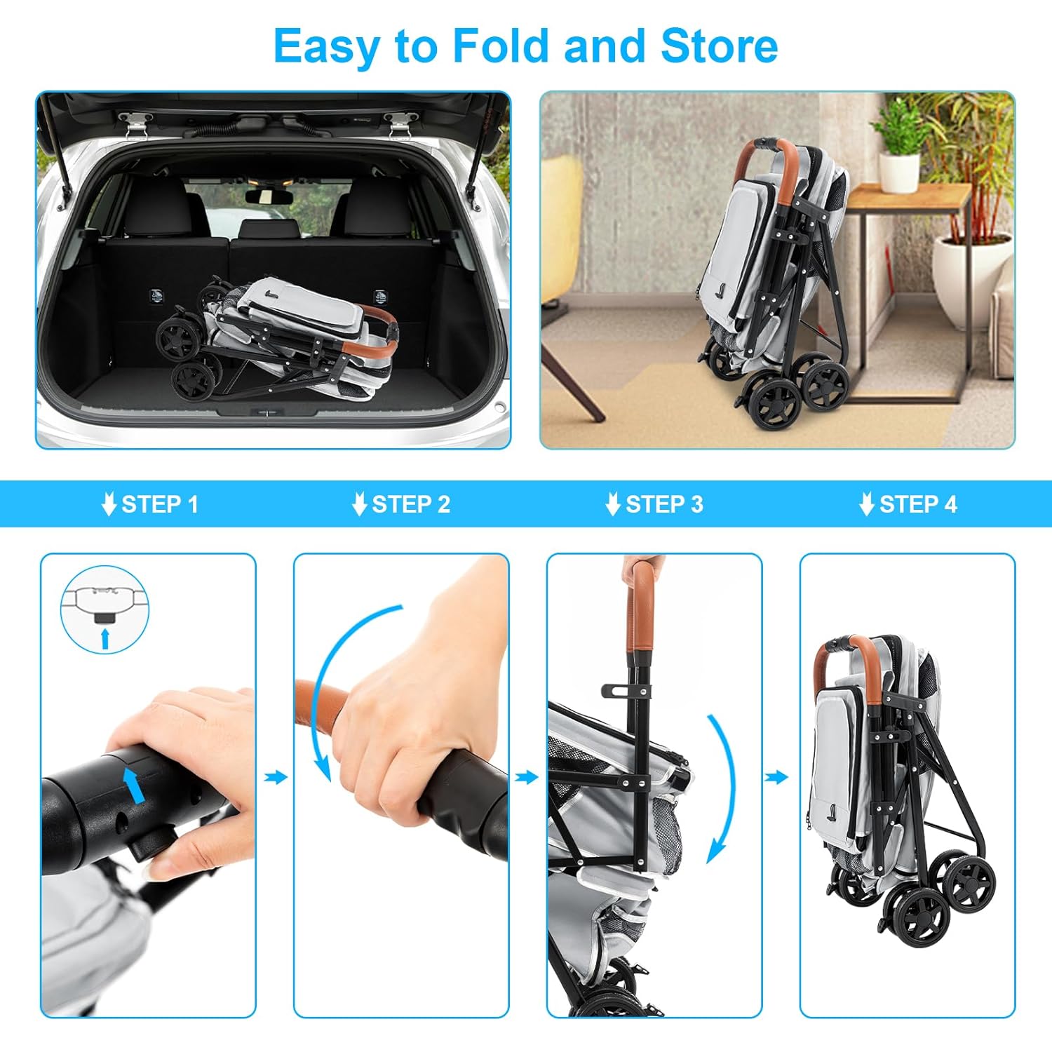 Fácil de montar y plegar: nuestro cochecito para mascotas puede ser montado fácilmente por una persona en pocos minutos sin ninguna herramienta o habilidad. También se puede plegar fácilmente a un tamaño compacto para un almacenamiento cómodo cuando no está en uso.