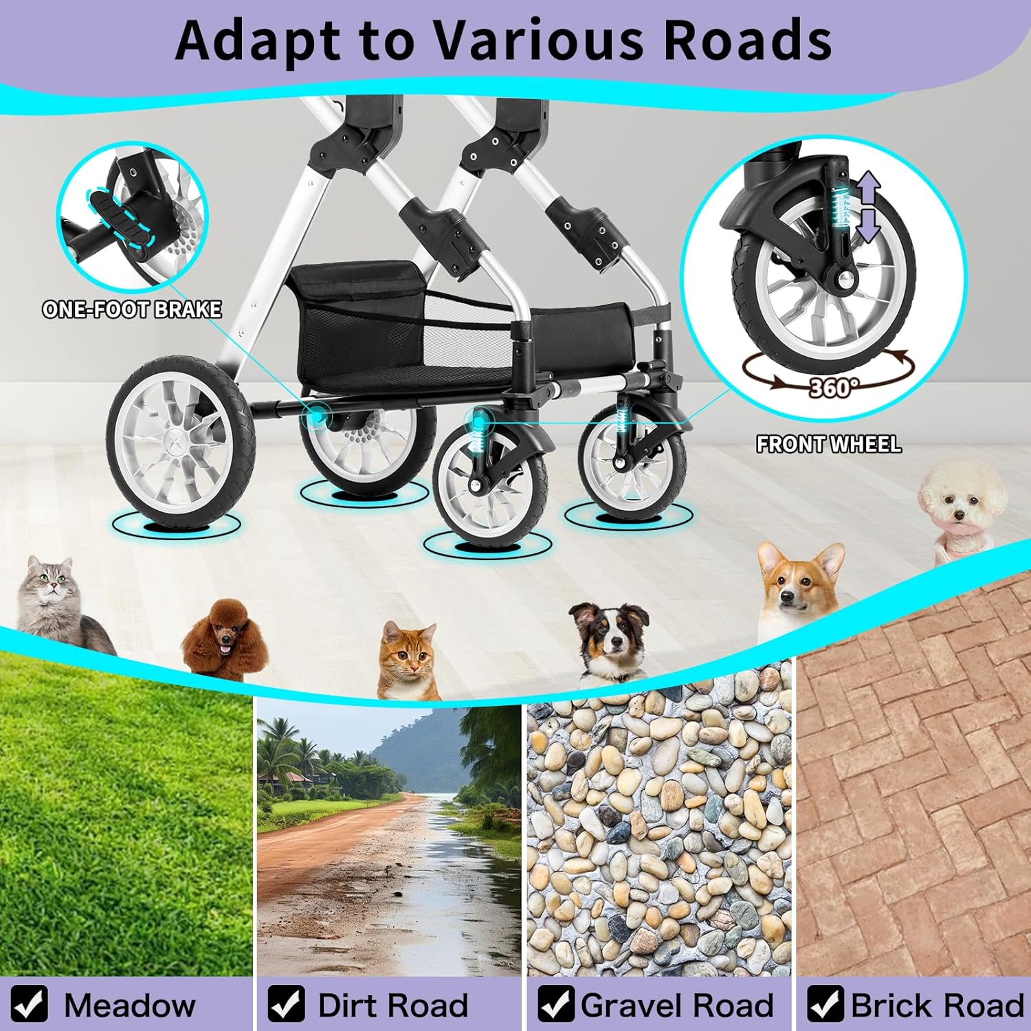 Ruedas de goma de grado automotriz: la rueda de goma no inflable de grado de automóvil es súper duradera y evita los problemas de mantenimiento. Puede reducir en gran medida la vibración y mejorar la estabilidad del cochecito, incluso en el suelo áspero. La rueda delantera puede girar 360° y tiene la función de orientación. Freno de un pie, simple y cómodo de usar.