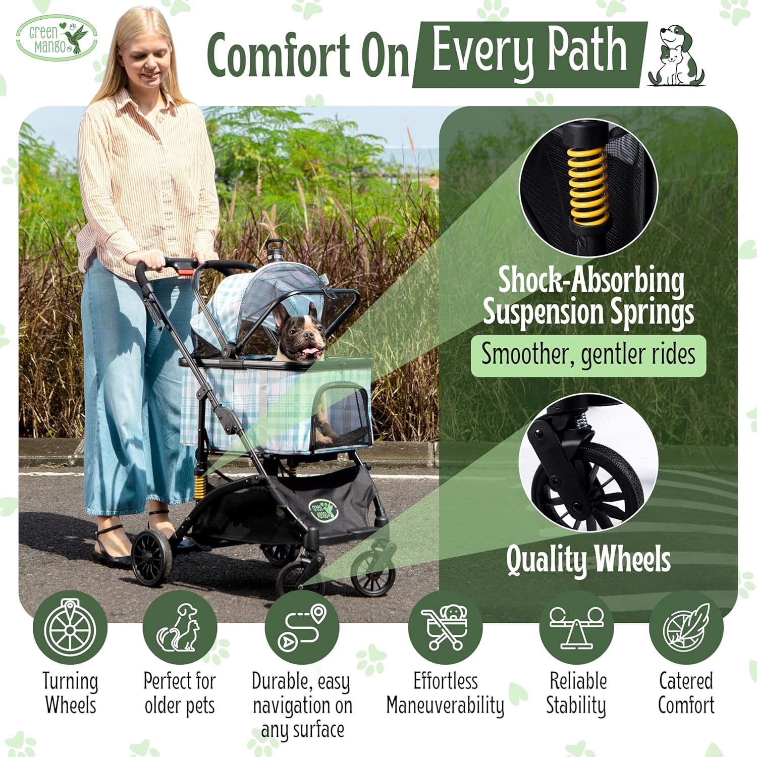 Paseo suave y estable: los resortes de suspensión y las ruedas de poliuretano duraderas permiten paseos suaves en superficies irregulares, ya sea que estés teniendo una caminata lenta y relajante o corriendo.
