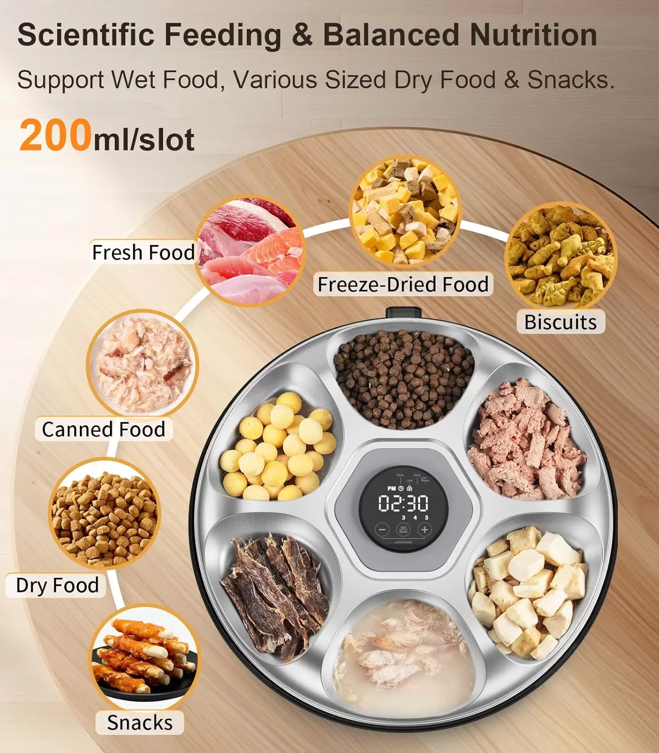 Alimentación programada para comida húmeda y seca A diferencia de los dispensadores de torre que solo aceptan pellets, este comedero cuenta con 6 bandejas independientes. Esto permite ofrecer a su mascota una dieta equilibrada que incluya comida húmeda, sobres (wet food) o raciones frescas. Puede programar hasta 5 comidas automáticas más una inmediata, ideal para mantener la rutina de su gato o perro pequeño durante el día o el fin de semana.
