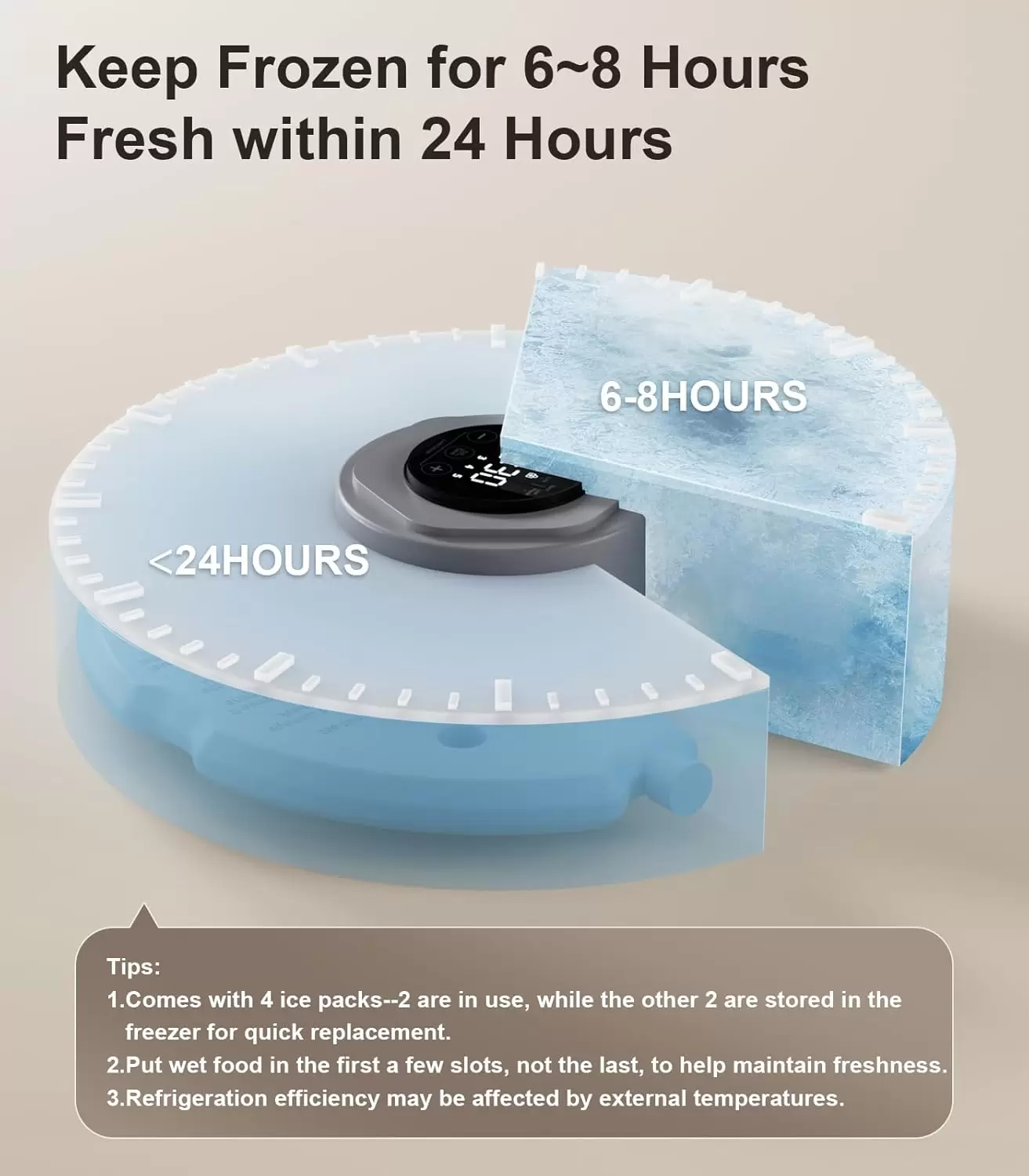 Frescura garantizada por 24 horas Entendemos la preocupación por la descomposición de la comida húmeda, especialmente en verano. Este equipo incluye packs de hielo reutilizables que se colocan bajo las bandejas, manteniendo el alimento fresco y en óptimas condiciones hasta por 24 horas. El paquete incluye 4 unidades para que siempre tenga un par congelado listo para el recambio.