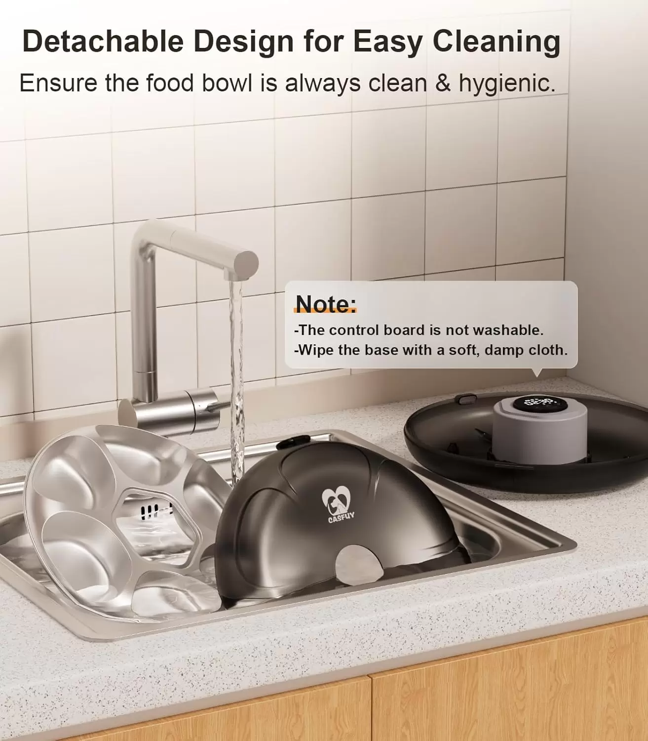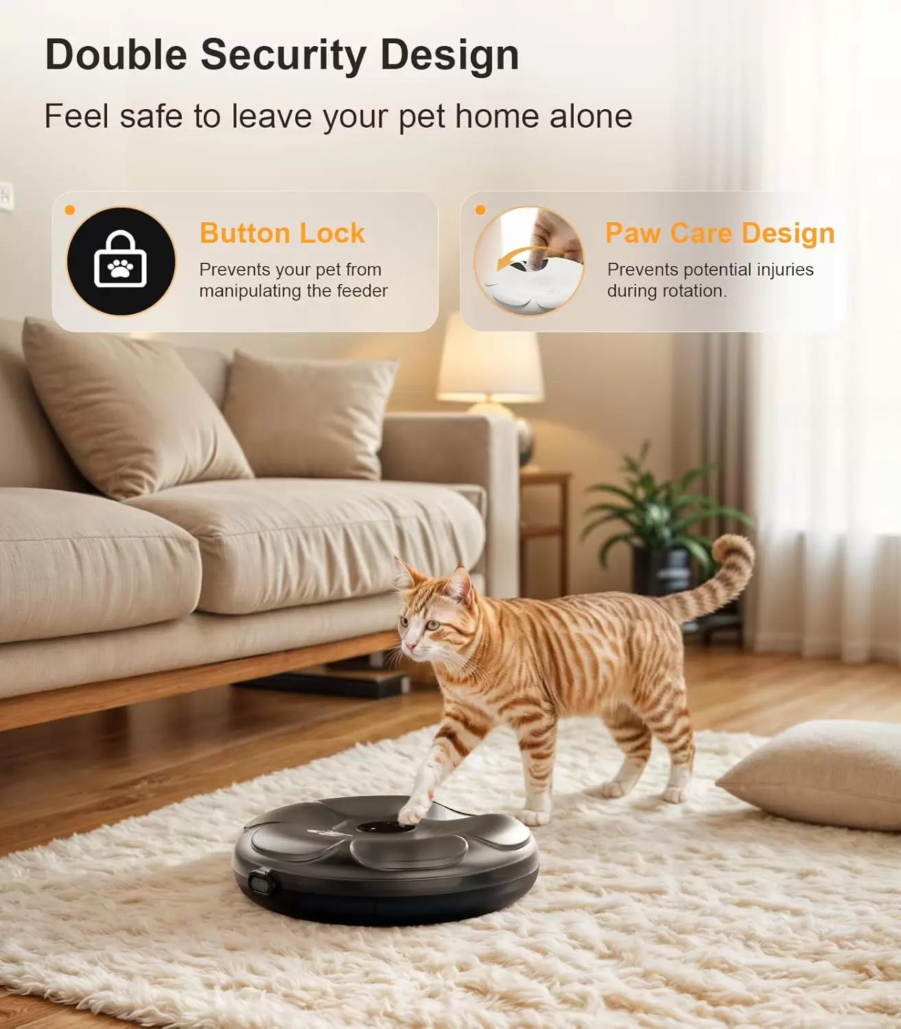 Tecnología intuitiva y seguridad para su mascota Configurar el horario de alimentación es simple gracias a su pantalla LCD y panel táctil con memoria (no pierde la configuración al apagarse). Además, cuenta con un sistema de seguridad que detecta si la mascota pone su pata mientras el plato gira, deteniéndose para evitar lesiones. Está fabricado en material ABS libre de BPA, asegurando una alimentación higiénica y segura.